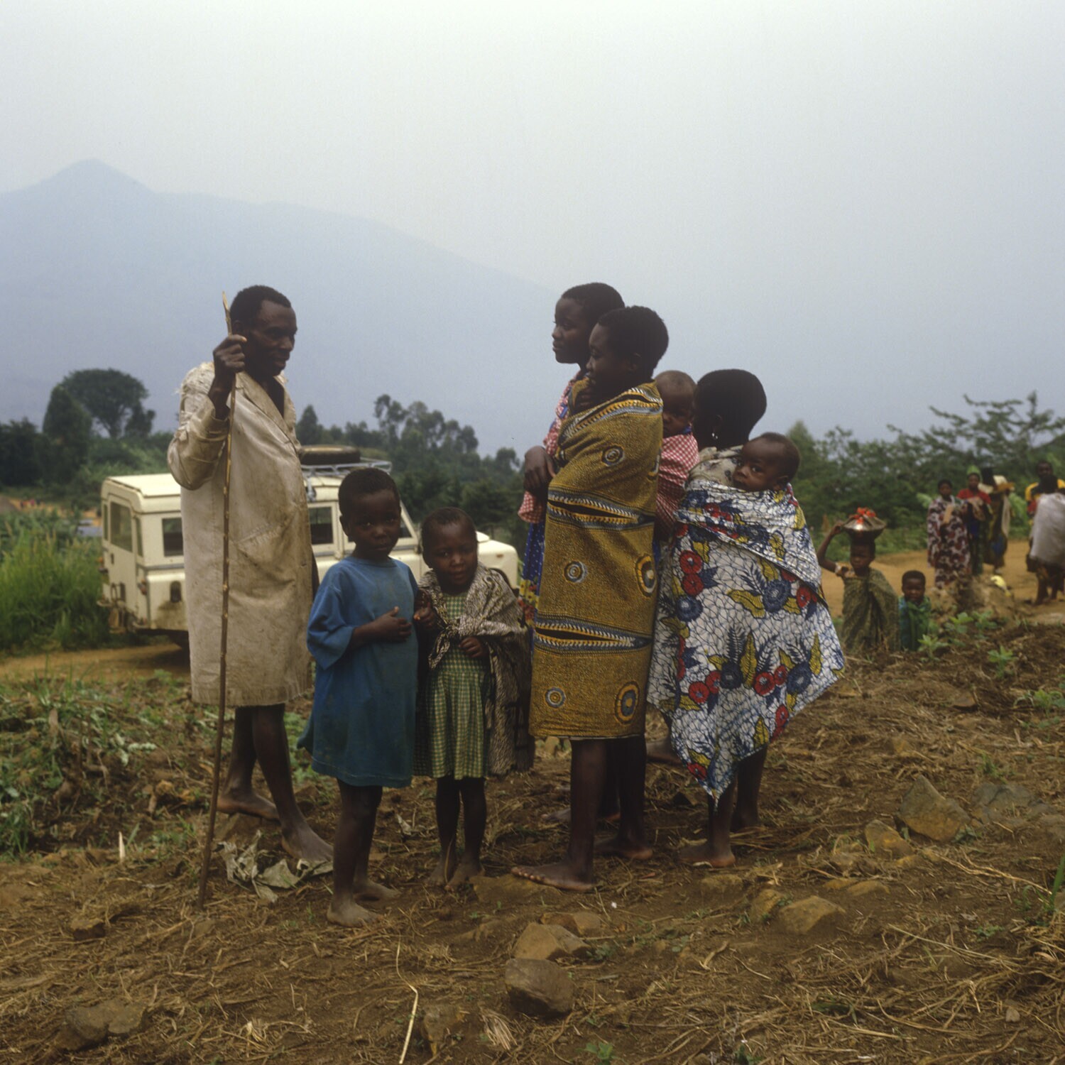 Kinderen, de groteren met broertjes of zusjes op de rug in de buurt van Kyondo.