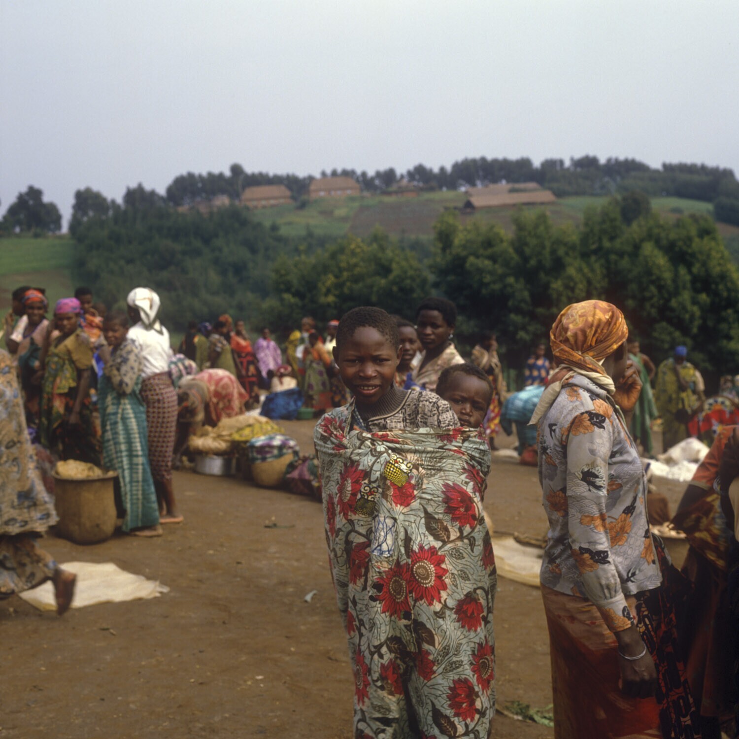 Kinderen, de groteren met broertjes of zusjes op de rug in de buurt van Kyondo.