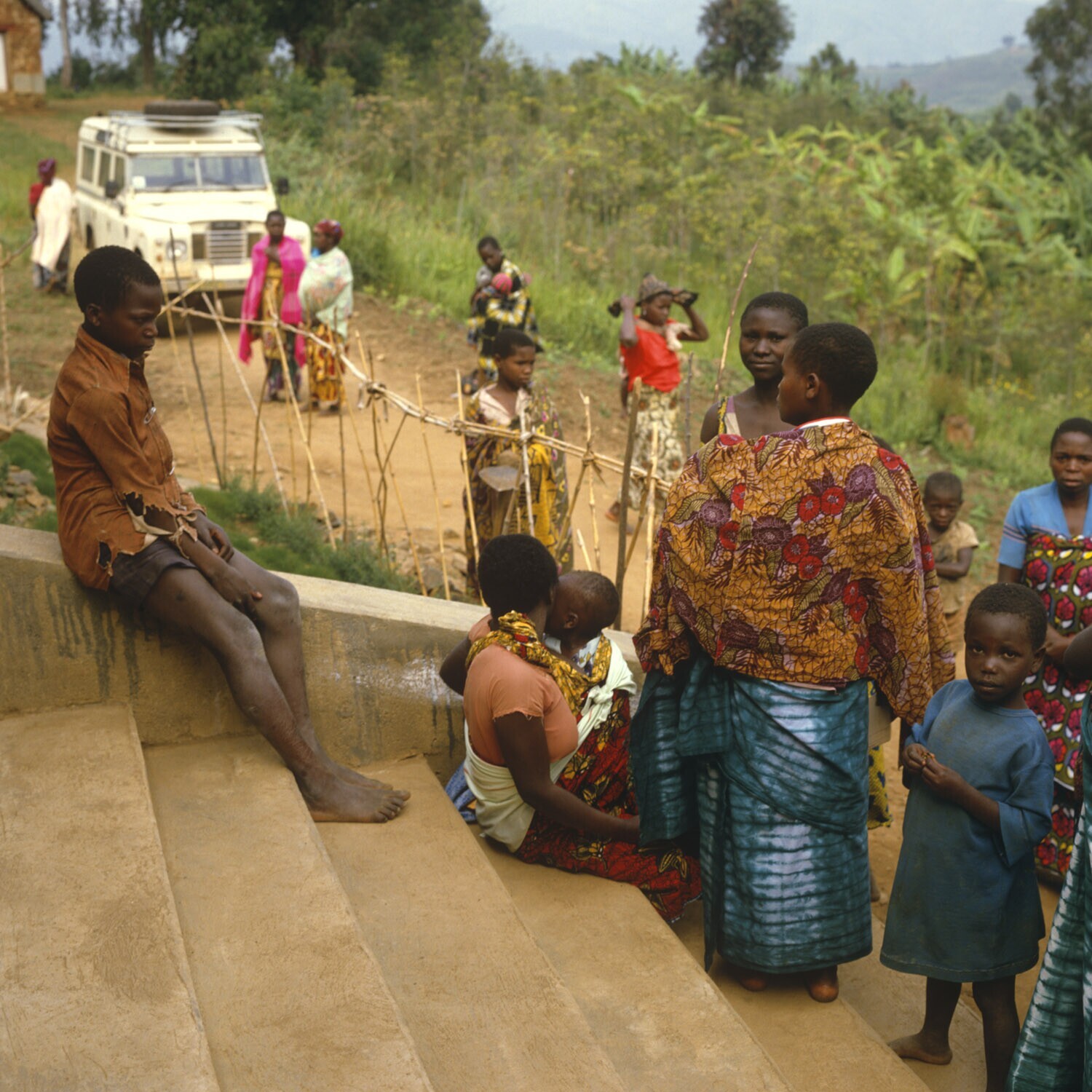 Wachtende mensen bij een post van de lokale gezondheidszorg opgezet door de parochie in Kyondo.