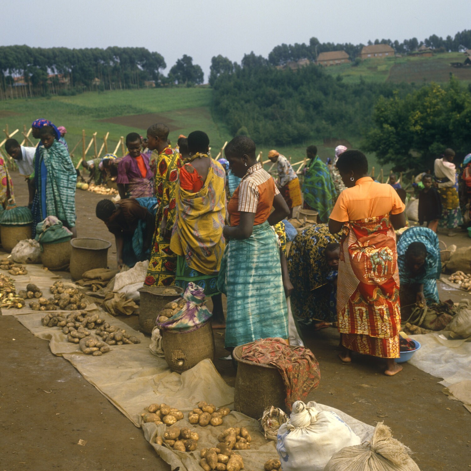 Vrouwen verkopen aardappels op de markt te Kyondo.