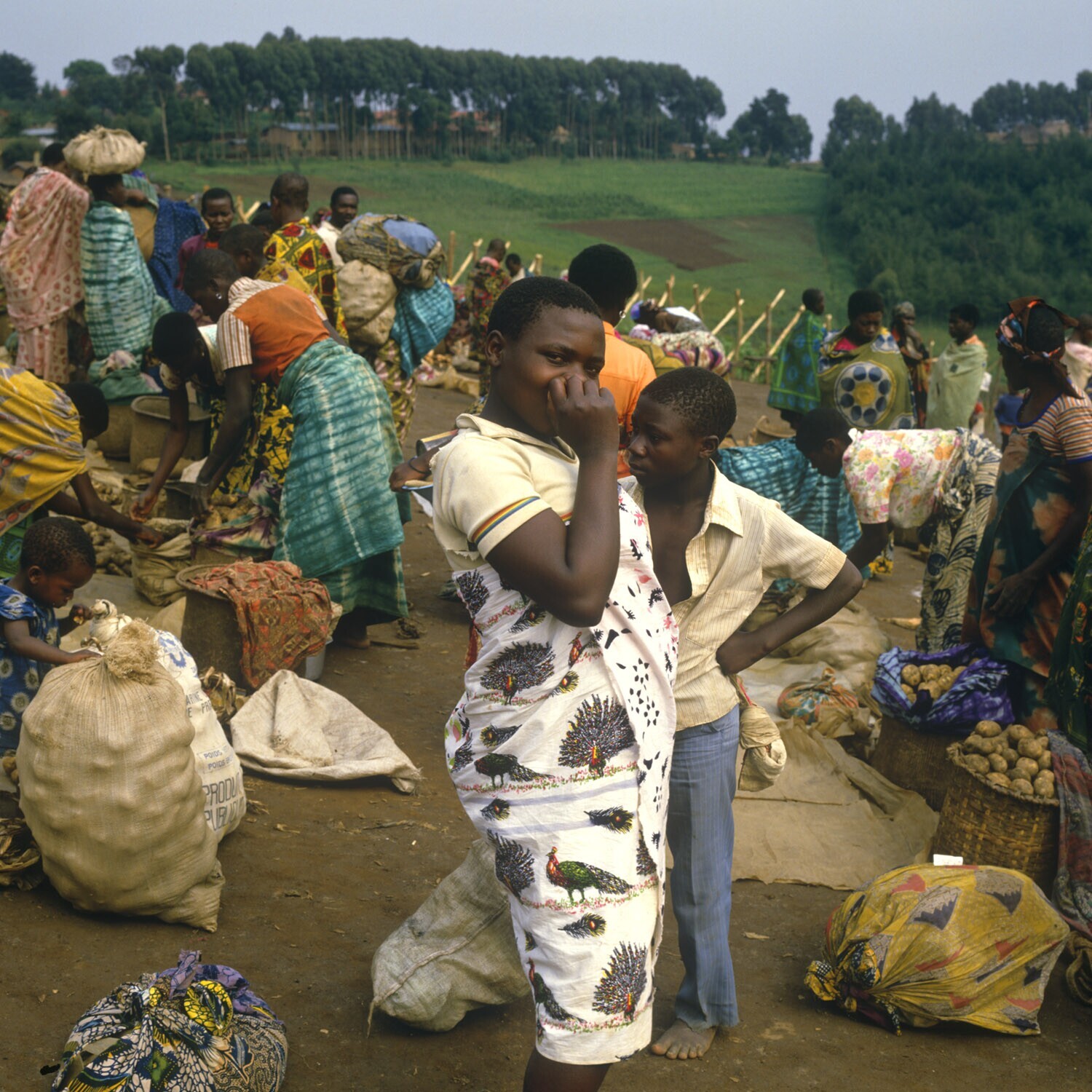 Vrouwen verkopen aardappels op de markt te Kyondo.