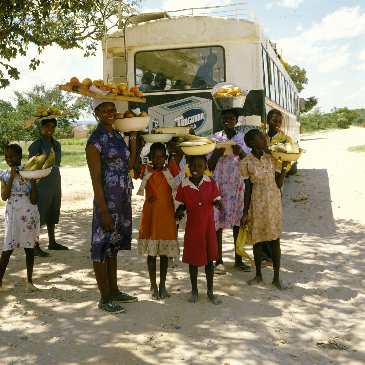 Gatooma. Vrouwen en kinderen verkopen etenswaren bij een bus.