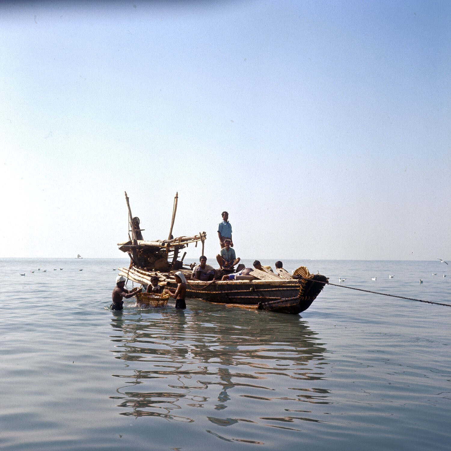 Drie vissers, staande in het water bij hun boot, bezig hun mand met vis uit het water op te halen
