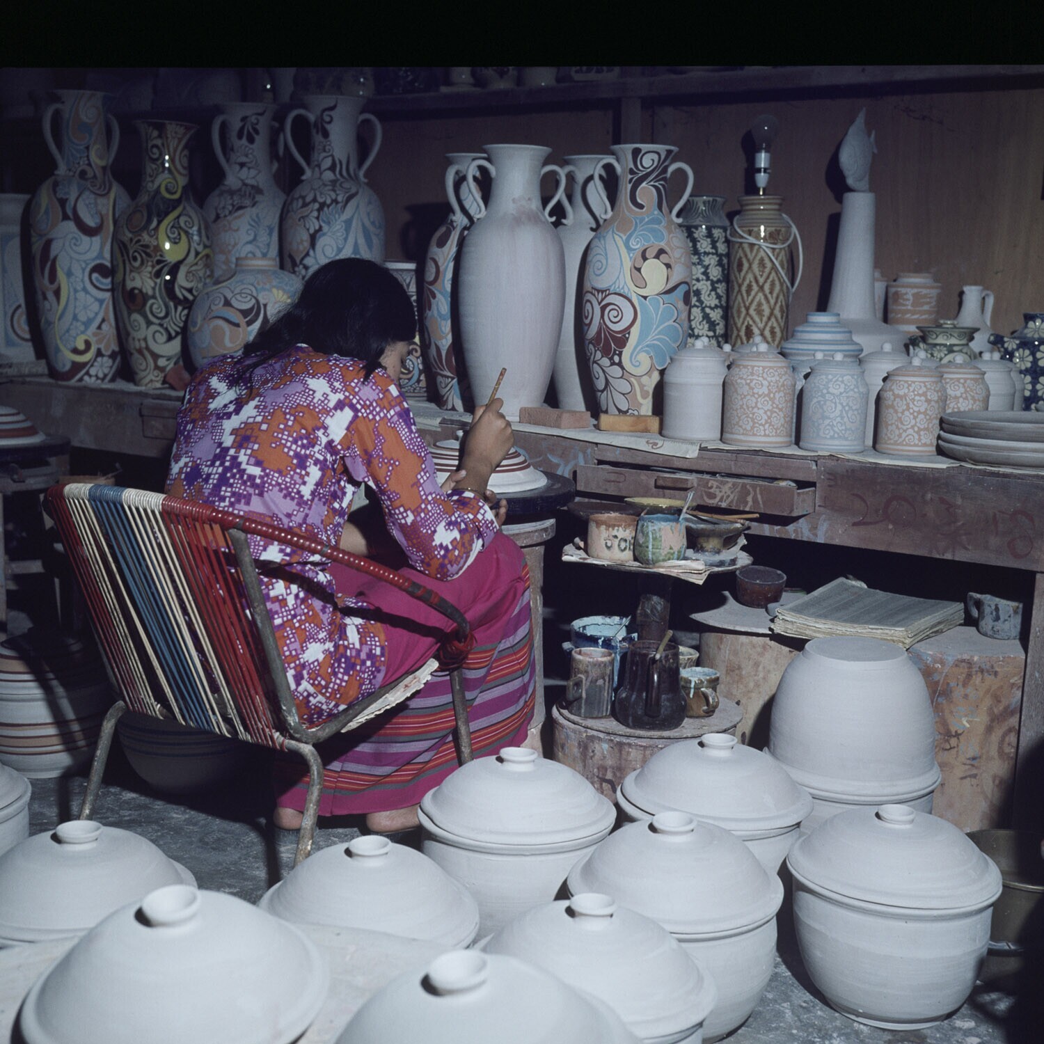 Pottenbakkerij bij kampung Macap ( fam. Aw Eng Kwang ) het beschilderen van de potten