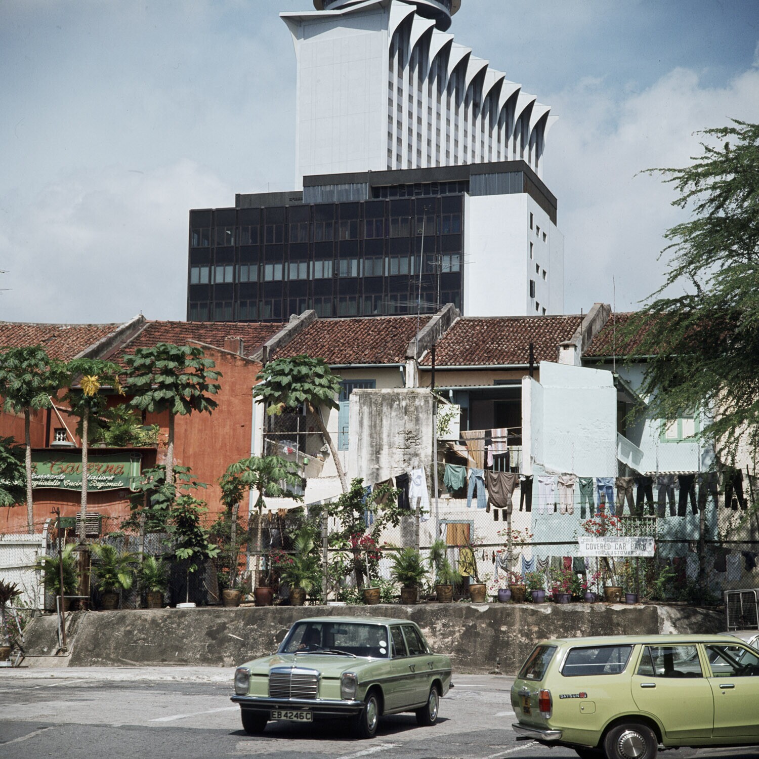 Contrast oud en nieuw op Orchard Road, oude Chinese woningen en het Mandarin Hotel