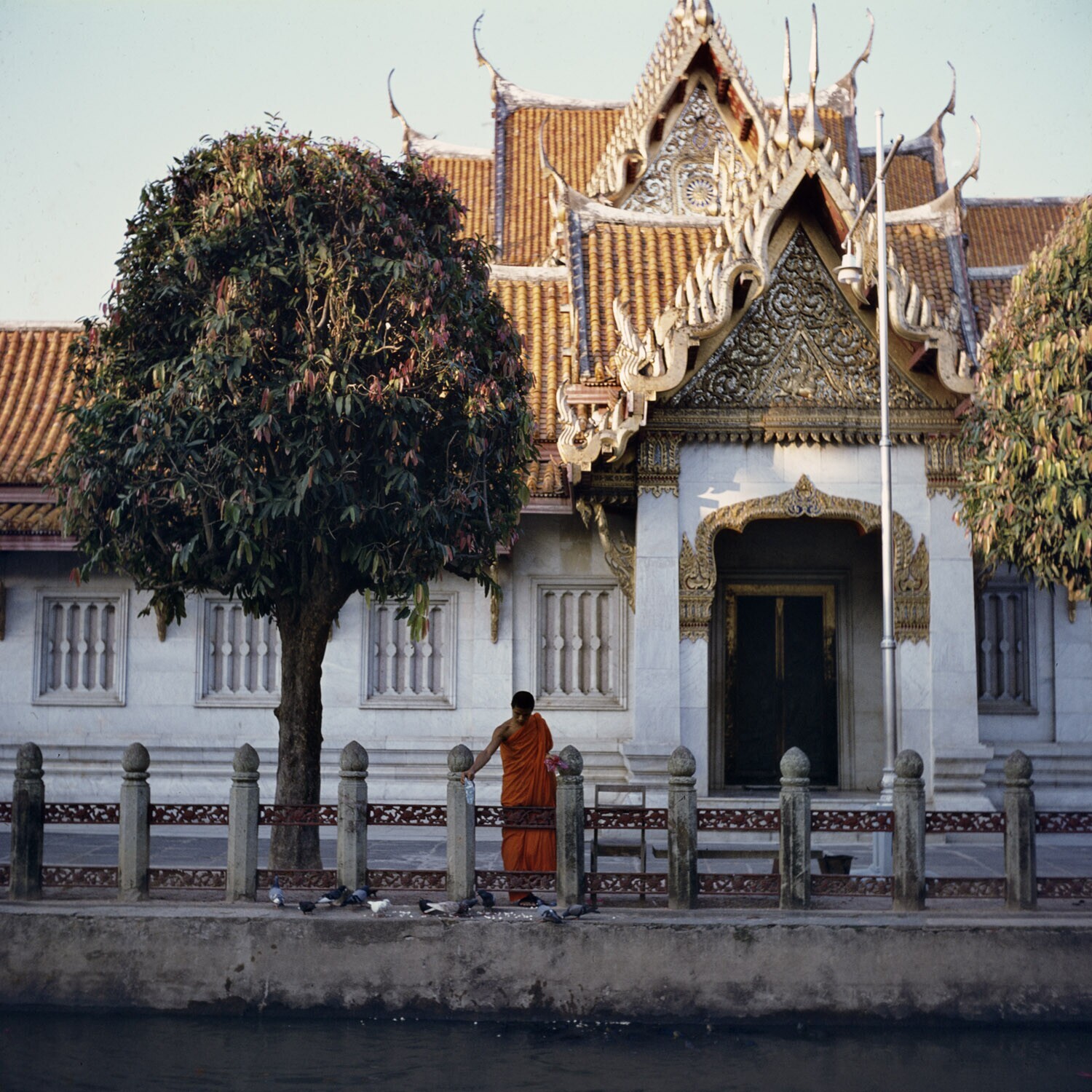 Een boeddhistische monnik voert duiven en schildpadden in de tuin van 'De marmeren tempel' (Wat Benchamabophit Dusitvanaram) in Bangkok