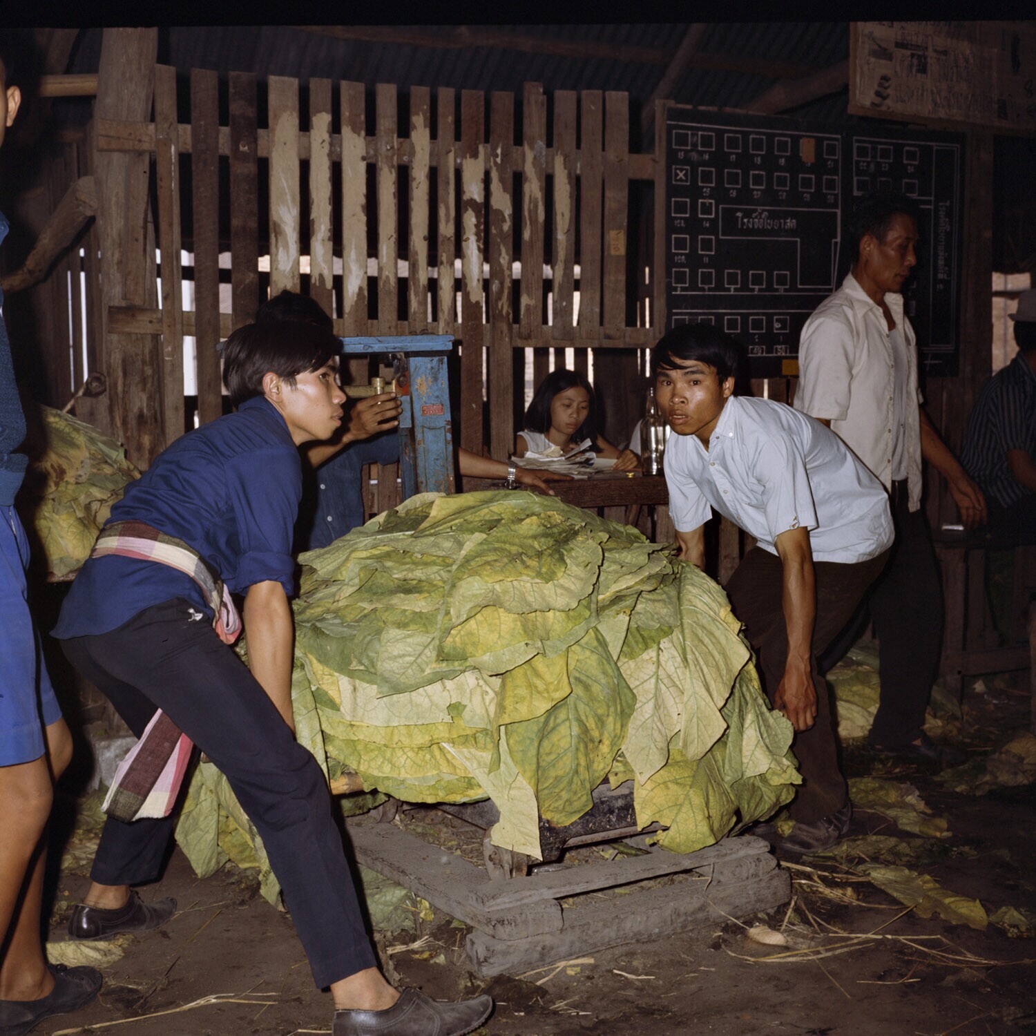De geoogste tabaksbladeren woeden in eer loods gebracht waar ze op kwaliteit worden gesorteerd en vervolgens op stokken gebonden voor het drogingsproces Ban Mae FFh, t.o. Chieng Mai