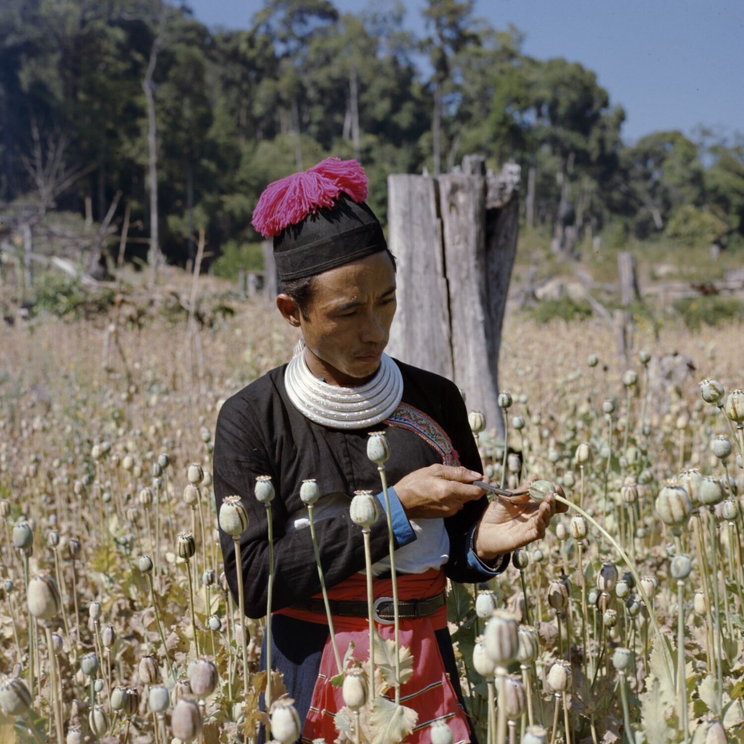 Een Meo-man trekt groeven in het vruchtbeginsel van de papavecHieruit vloeit een kleverige, bruine substantie:opium,die er met een plat metalen voorwerp vanaf geschraapt wordt Noord Thailand