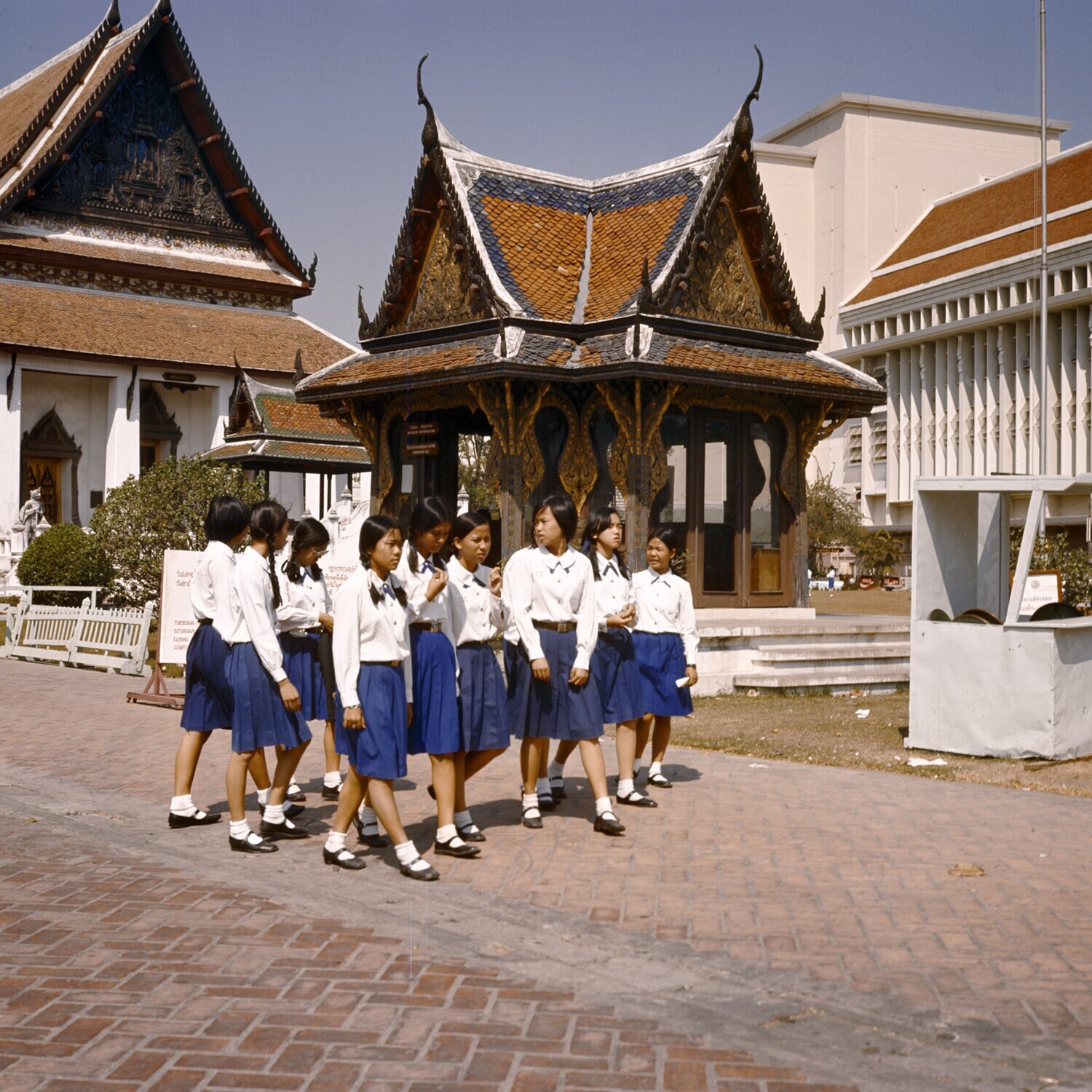 Groep schoolmeisjes in uniform in het National Museum in Bangkok