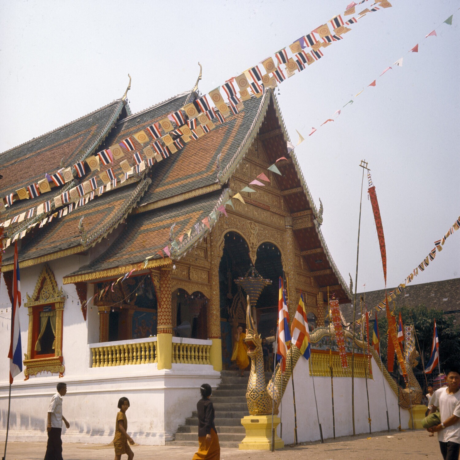 Pas gerestaureerde dorps Wat feestelijk versierd te gelegenheid van de heropening. Bij zo'n gelegenheid wordt er uitgebreid feest gevierd waarbij iedereen geld geeft om in de bouwkosten tegemoet te komen Centrale vlakte