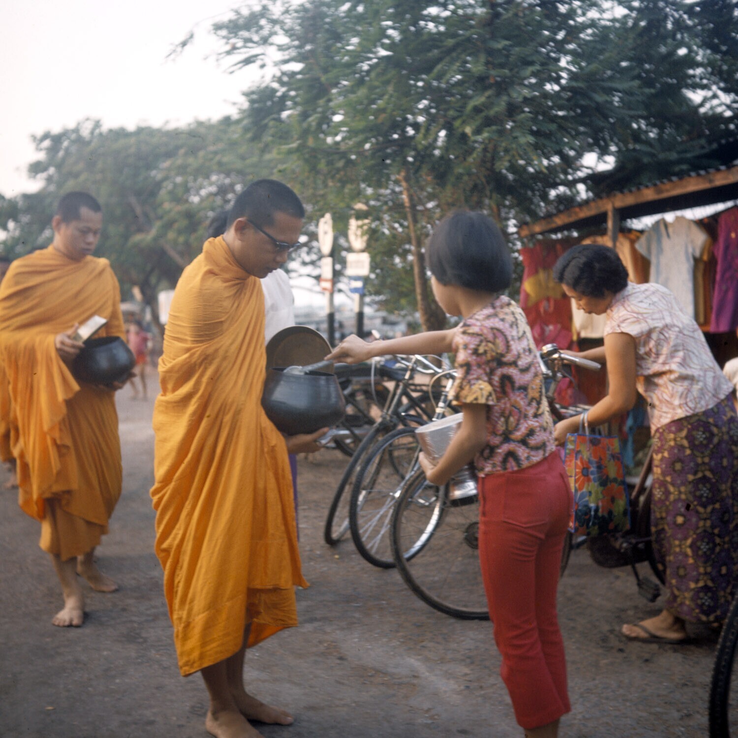 Iedere ochtend tegen zonsopgang verlaten de monniken het klooster en trekken in een rij langs de gelovigen die voor hun woningen staan te wachten om hun offer van rijst in de zwarte bedelnappen van de monniken te deponeren. Deze voedselgift behoort tot ee