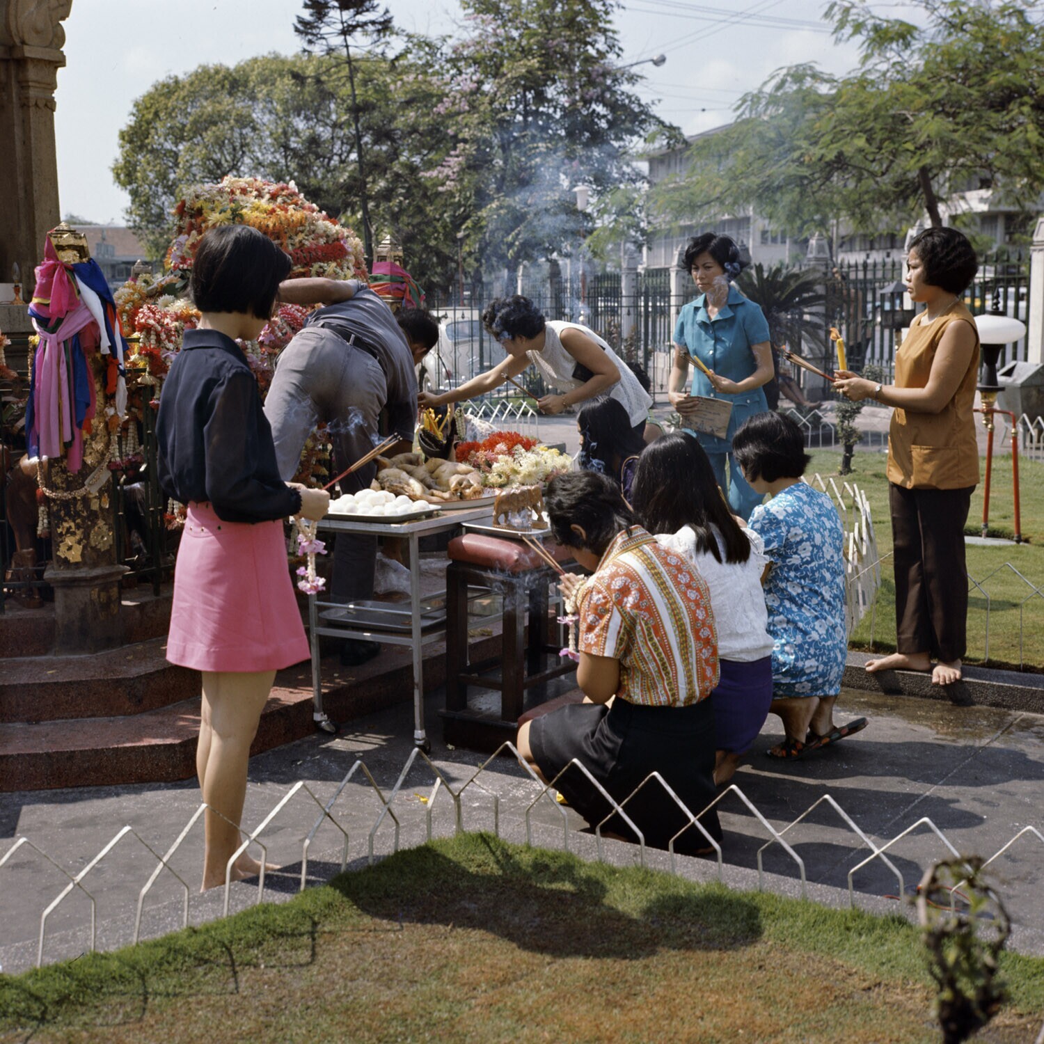Offers van o.a. bloemen, kaarsen en wierookstokjes aan Phra Pbrom (Brahna). Veel jonge vrouwen wenden zich tot Phra Phrom voor een kinderrijk huwelijk Centrum Bangkok
