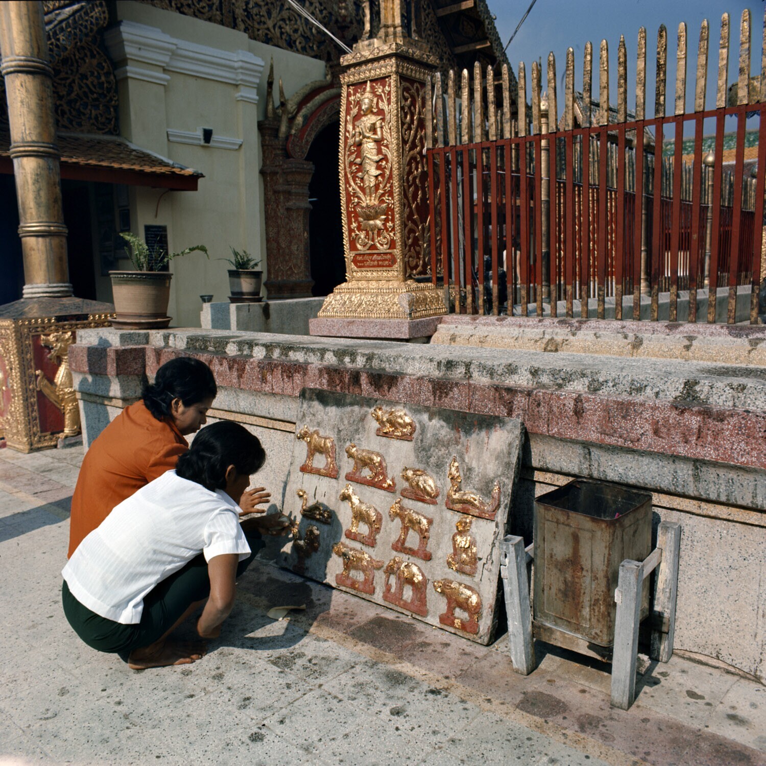 Naast bloemen, kaarsen en wierook is ook het plakken van stukjes bladgoud op voorwerpen van verering een gebruikelijk offer. Wat Doi Sutlep,Chieng Mai