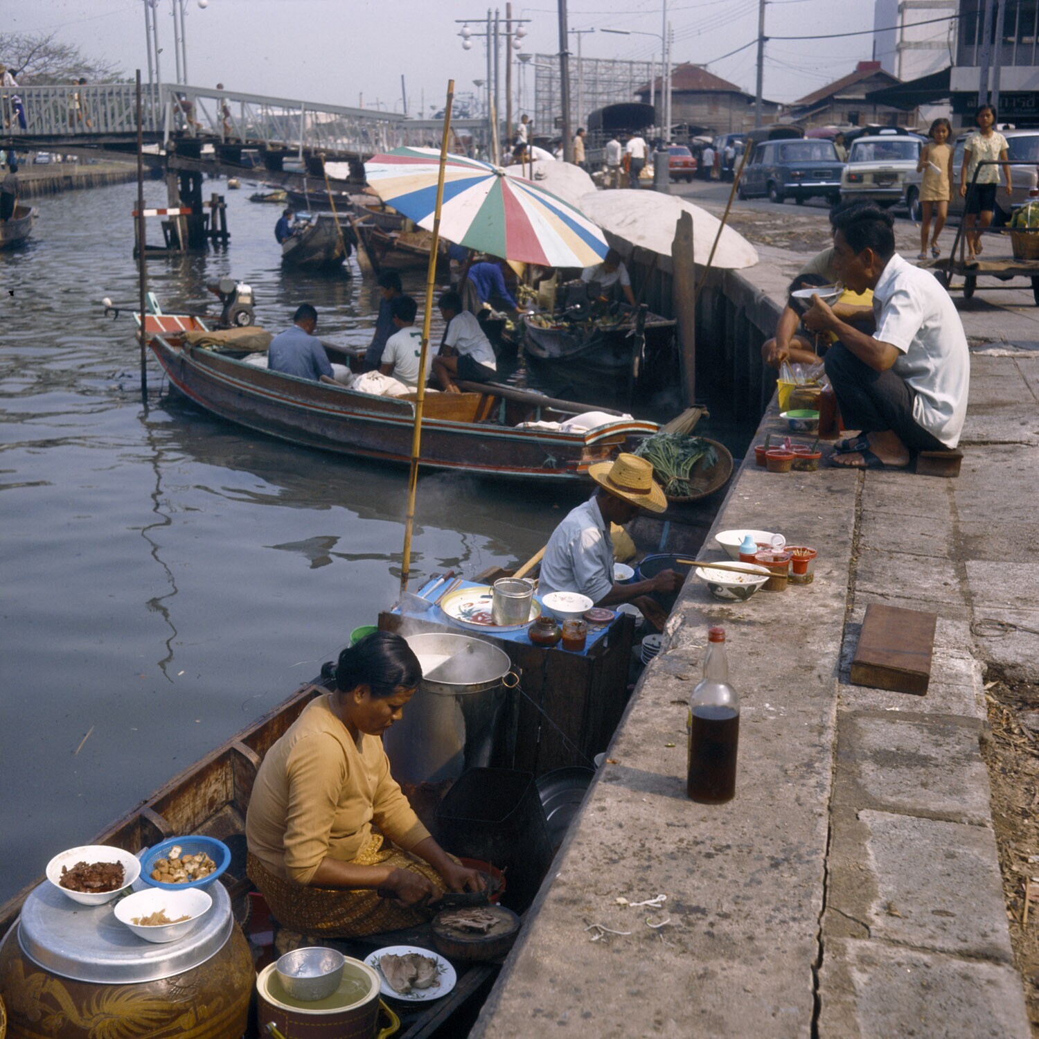 Bangkok Drijvend eetstalletje. Voor weinig geld krijgt men hier een maaltijd bestaand uit rijst met wat groente en een vissaus, pittig gekruid, ziet er goed uit en smaakt redelijk