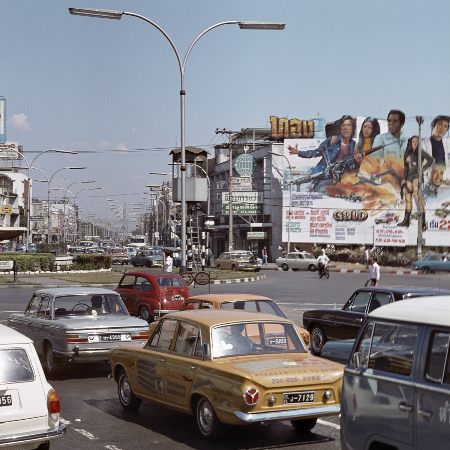 Straatgezicht in Bangkok met bioskoopreclamebord op achtergrond
