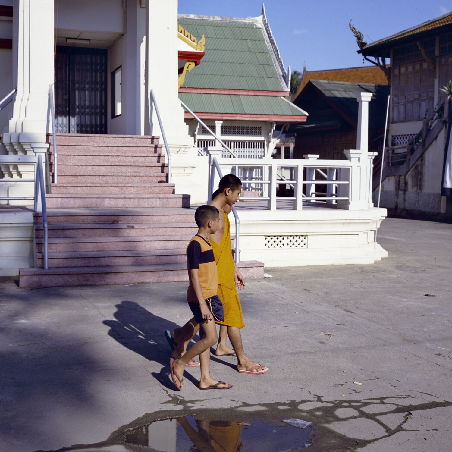 Kinderen, waaronder 1 monnik op straat in Bangkok