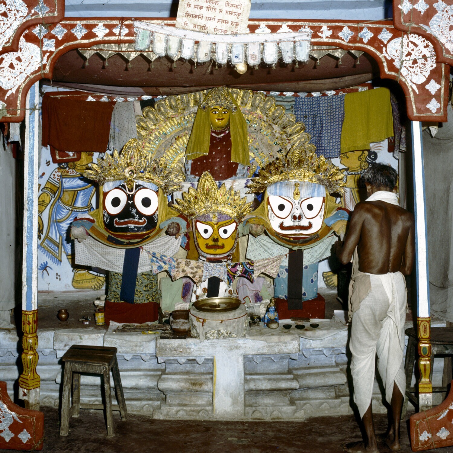 Een priester bezig voor het altaar in het klooster te Puri in de staat Orisa het altaar is voor de goden Subhadra en Jaganath