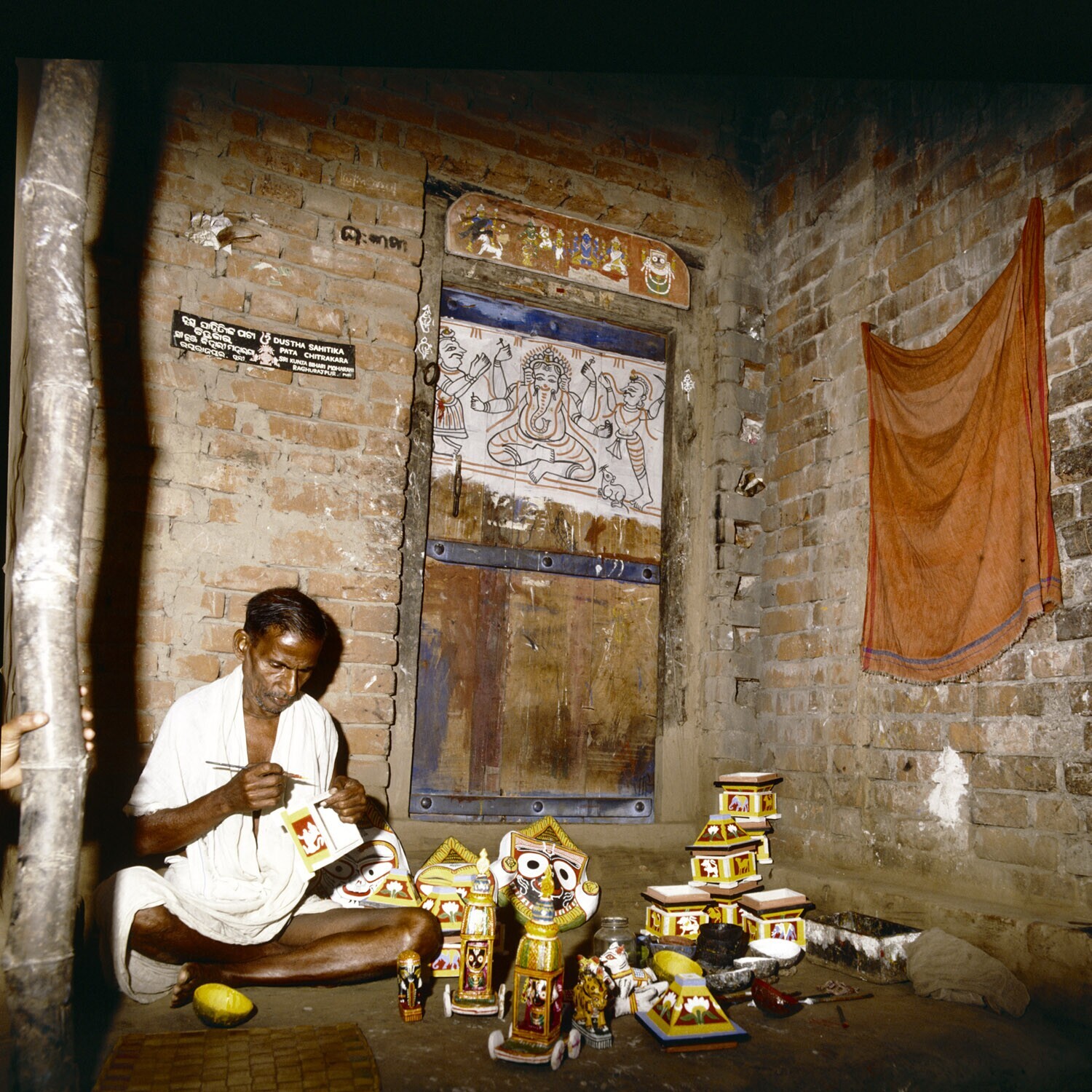 Het beschilderen van godenbeeldjes (van oa Jaganati door een kunstenaar in de staat Orissa