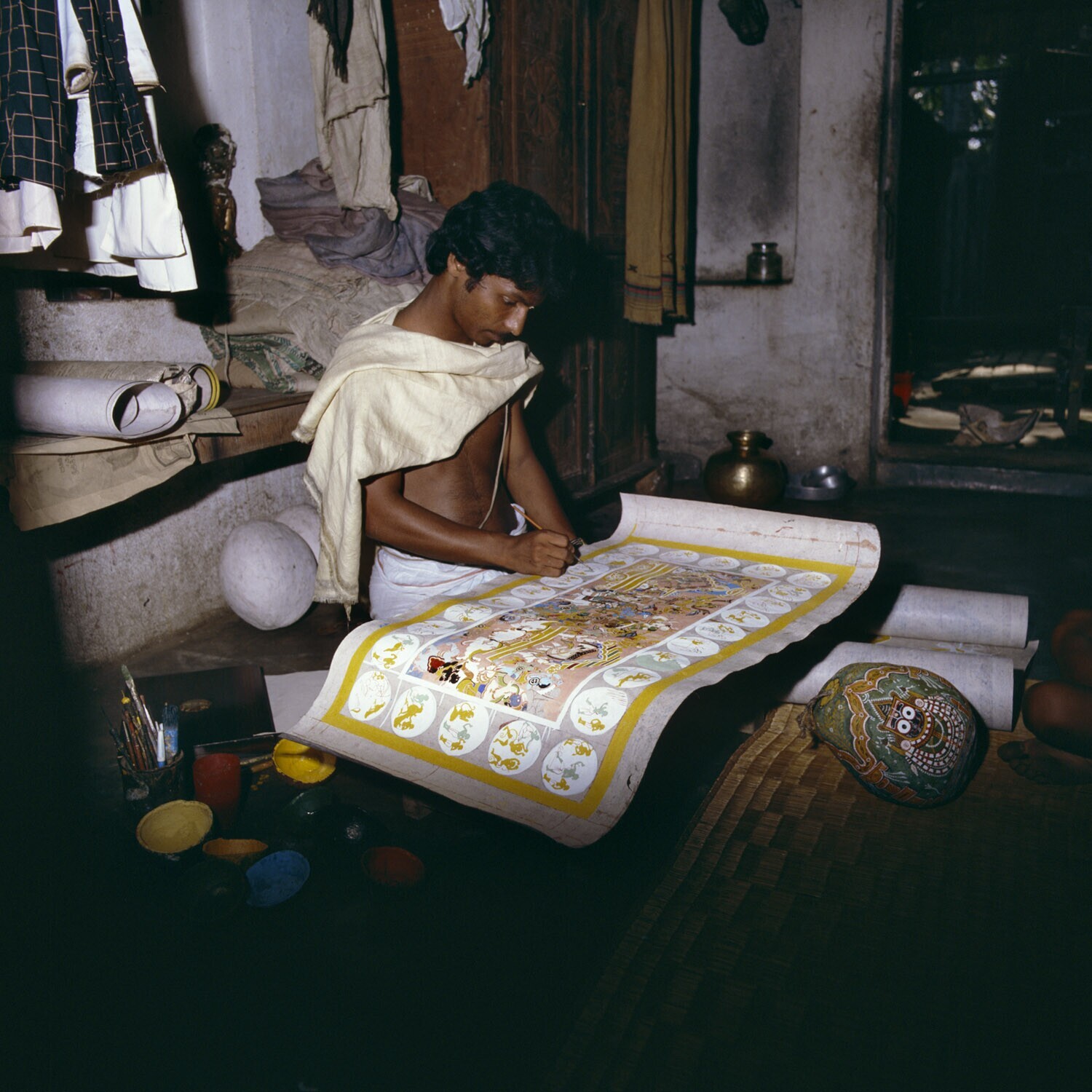 Een kunstenaar aan het werk met het schilderen van een verhaal op een speciale ondergrond voor hem een beschilderde groene cocosnoot met de afbeelding van de god Jaganath Achter zijn rug twee wit geschilderde cocosnoten wachtend om beschilderd te worden H
