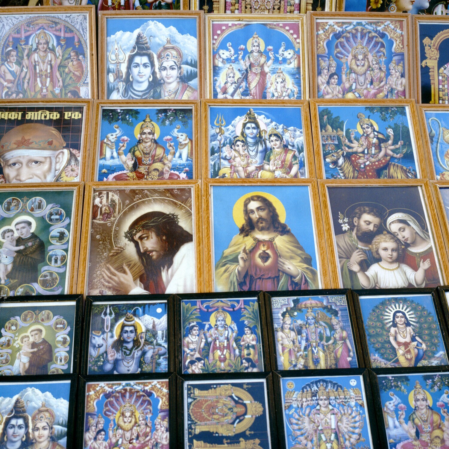 Detail van de godenprenten die op straat verkocht worden in Secunderabad