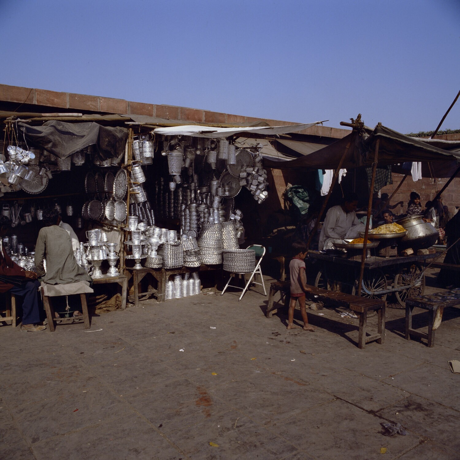 Een stalletje van een blikslager op de markt voor de Jami-moskee te New Delhi