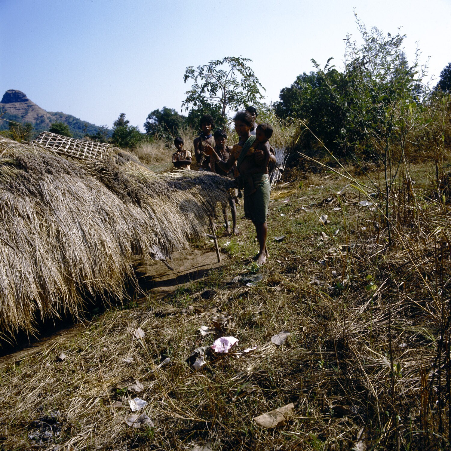 Een arme familie van boeren laat sorghum drogen in het gebied ten noorden van Mumbai