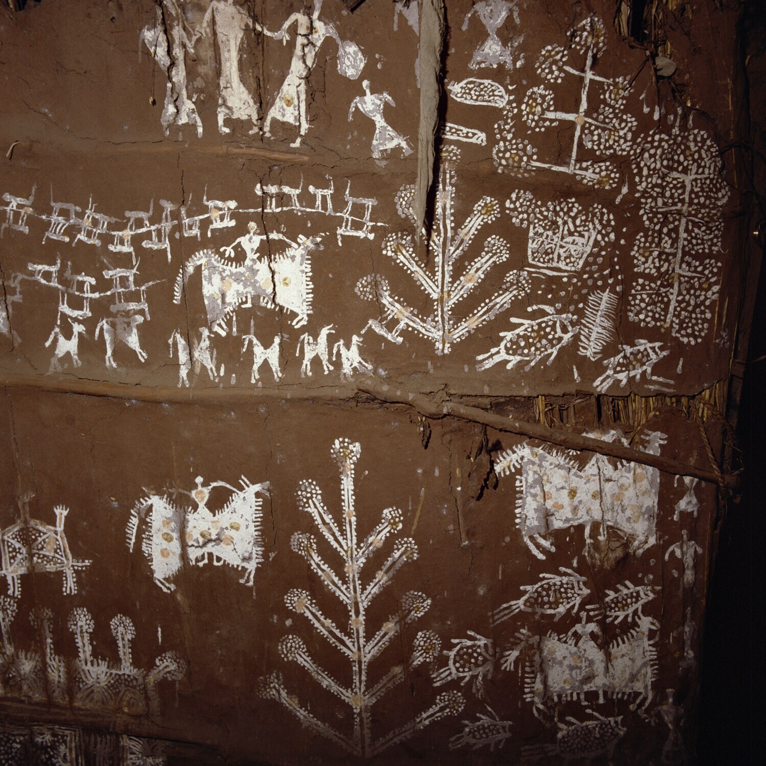 Een Wharli muurschildering. De traditie wil dat het oudste levende vrouwelijke familielid op de huwelijksdag van TTn van de meisjes op de keukenmuur de eerste tekening maakt, waarna andere vrouwen volgen. Aan de buitenkant van het huis tekeningen van gelu