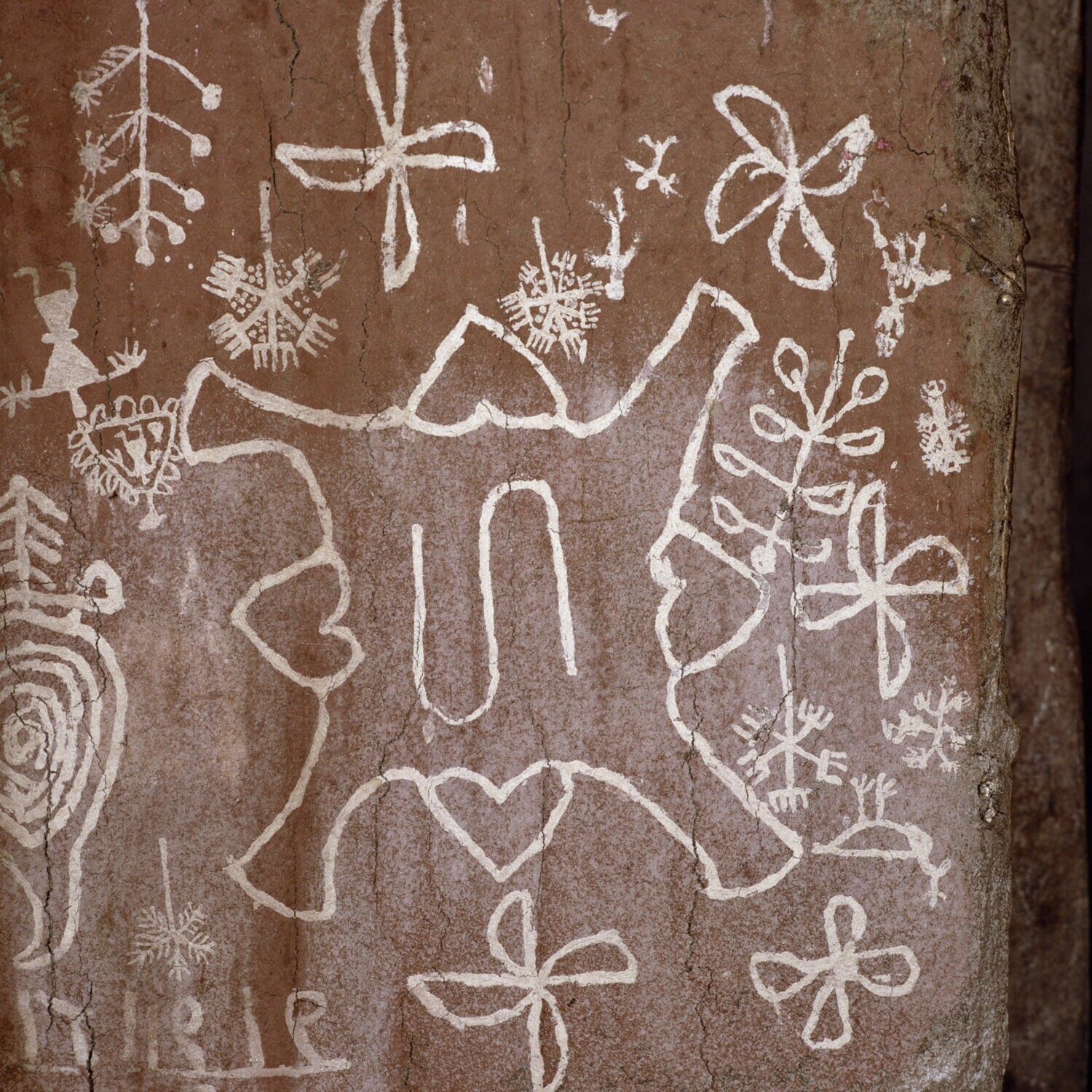 Een Wharli muurschildering. De traditie wil dat het oudste levende vrouwelijke familielid op de huwelijksdag van TTn van de meisjes op de keukenmuur de eerste tekening maakt, waarna andere vrouwen volgen. Aan de buitenkant van het huis tekeningen van gelu