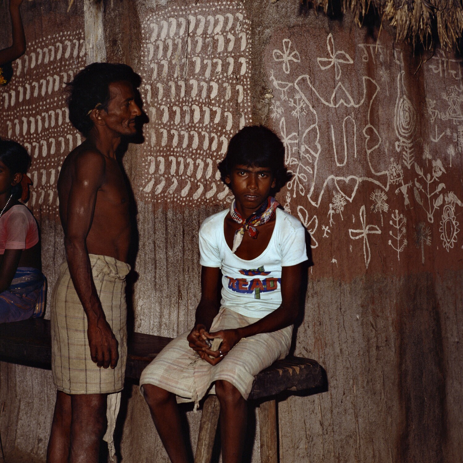 Een Wharli muurschildering. De traditie wil dat het oudste levende vrouwelijke familielid op de huwelijksdag van TTn van de meisjes op de keukenmuur de eerste tekening maakt, waarna andere vrouwen volgen. Aan de buitenkant van het huis tekeningen van gelu