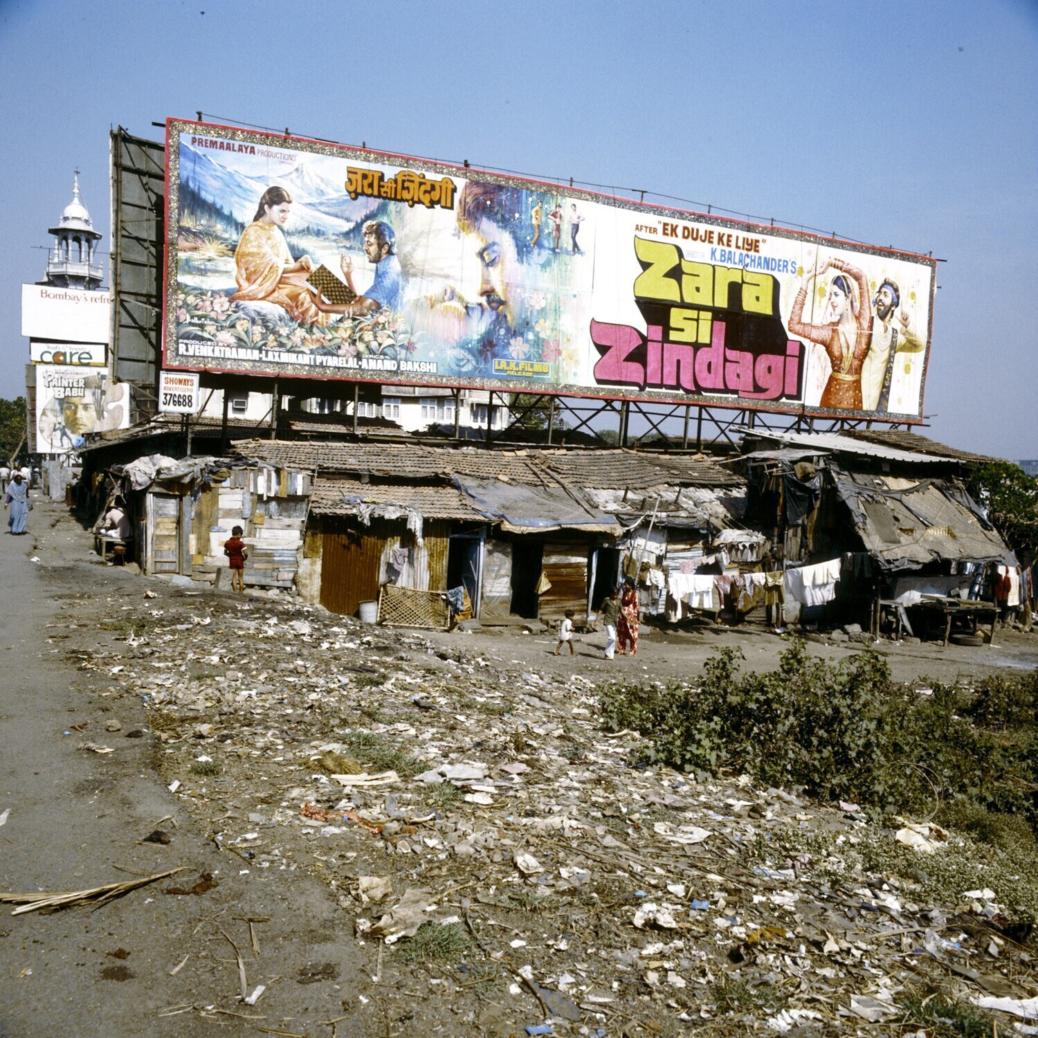 Enorm bioscoop reclamebord boven woningen iets voorbij Juhu, bij de afslag naar het vliegveld van Mumbai