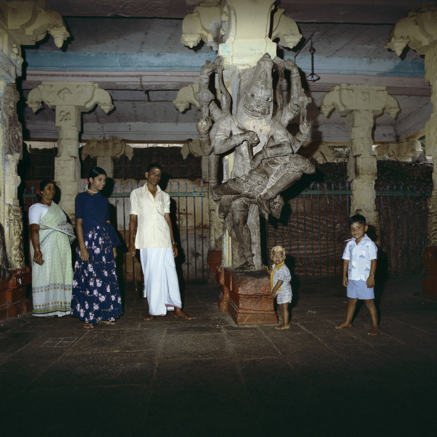 Bedevaartgangers in de grote zuilengalerij van de Alagarkoil tempel