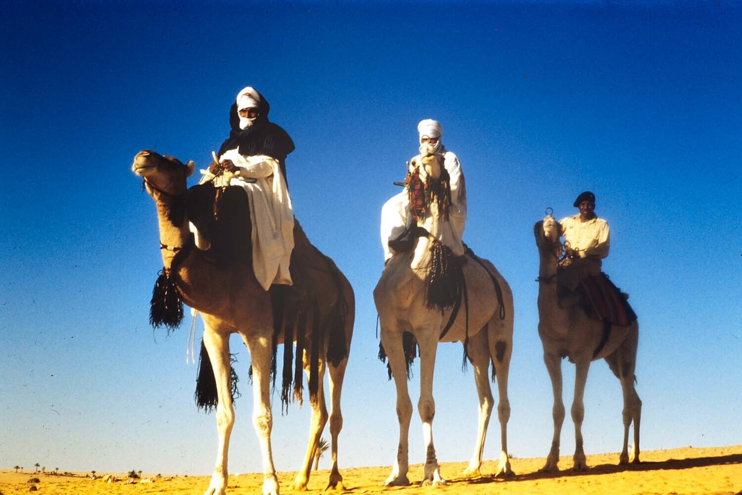 Drie mannen rijdend op dromedarissen in de woestijn