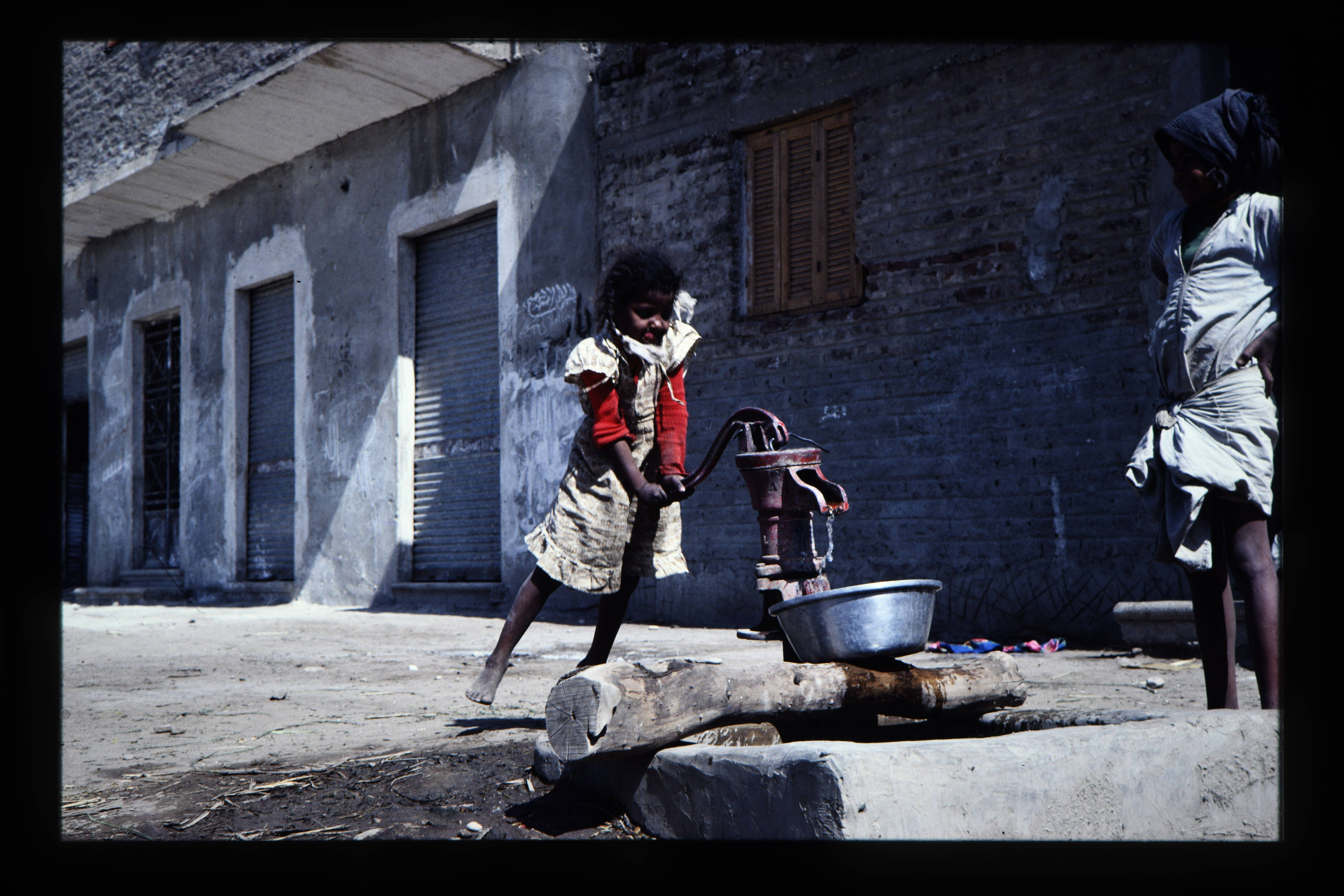'Meisje pompt water onder toeziend oog van haar moeder, dorpje bij Luxor.'
