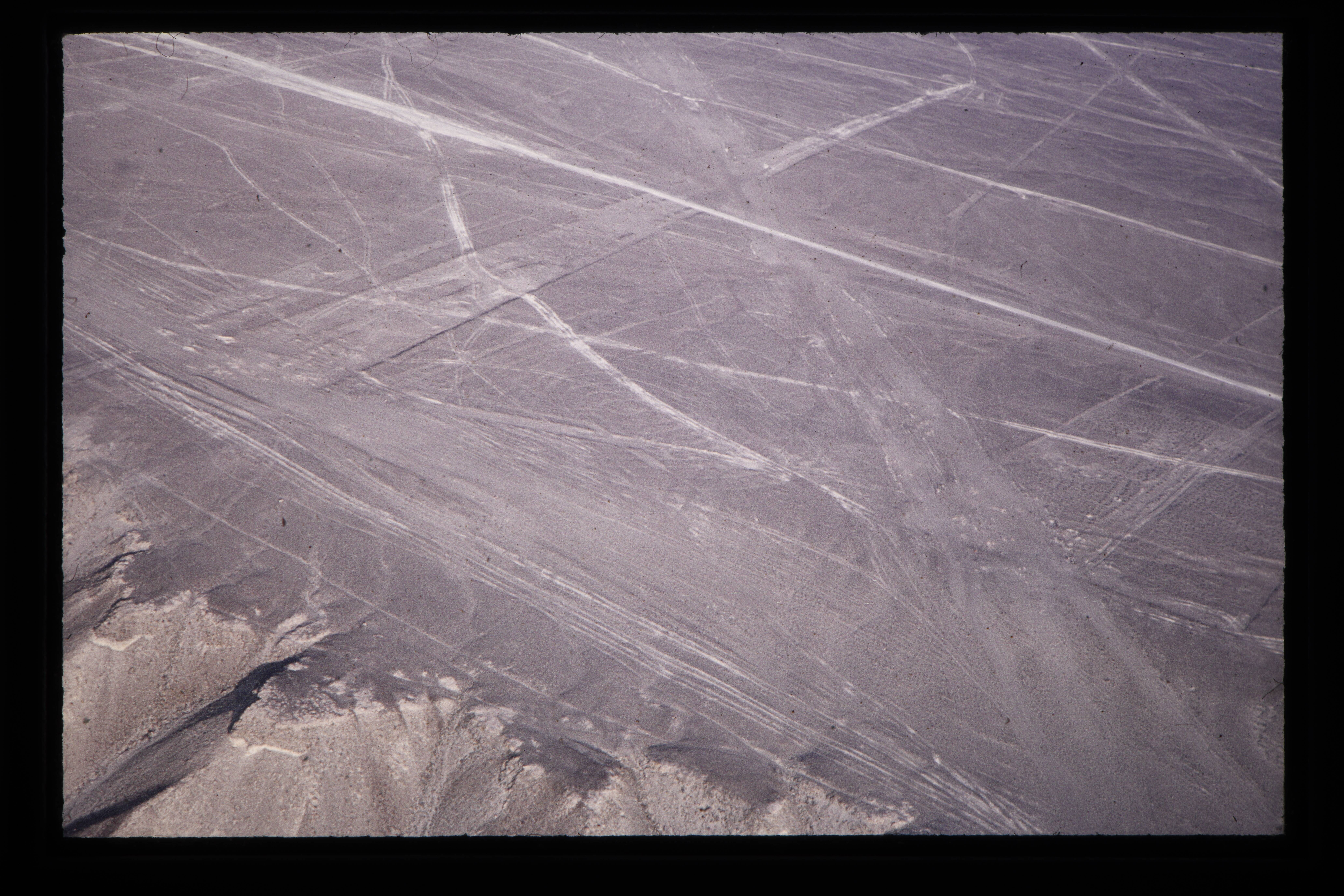 'Luchtopnamen Nasca-lijnen (woestijngebied); de tekeningen zijn soms beschadigd door bulldozers dan wel autosporen; door sommige zijn wegen aangelegd o.a. de Panameriana.'