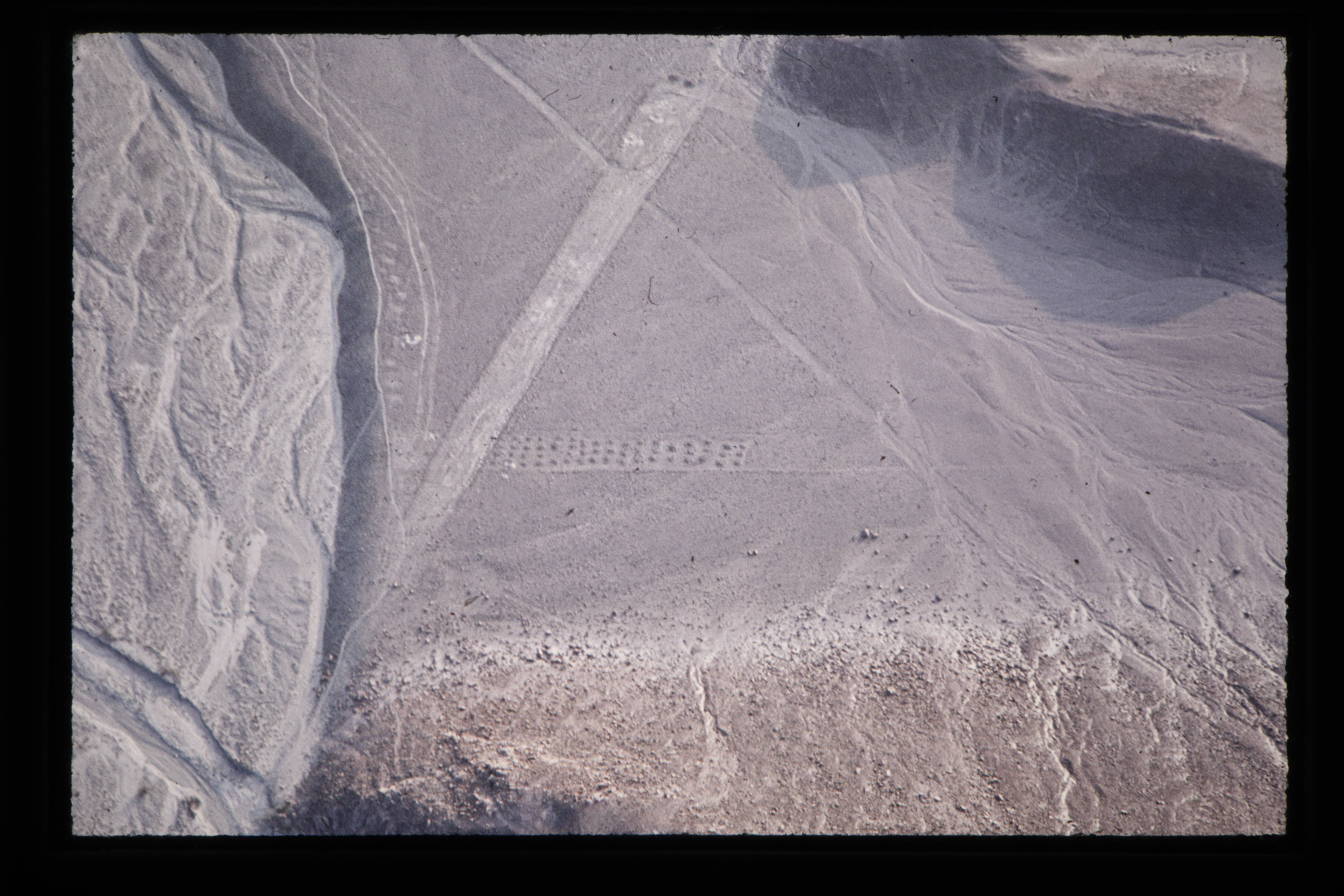 'Luchtopnamen Nasca-lijnen (woestijngebied) de tekeningen zijn soms beschadigd door bulldozers dan wel autosporen; door sommige zijn wegen aangelegd o.a. de Panameriana.'