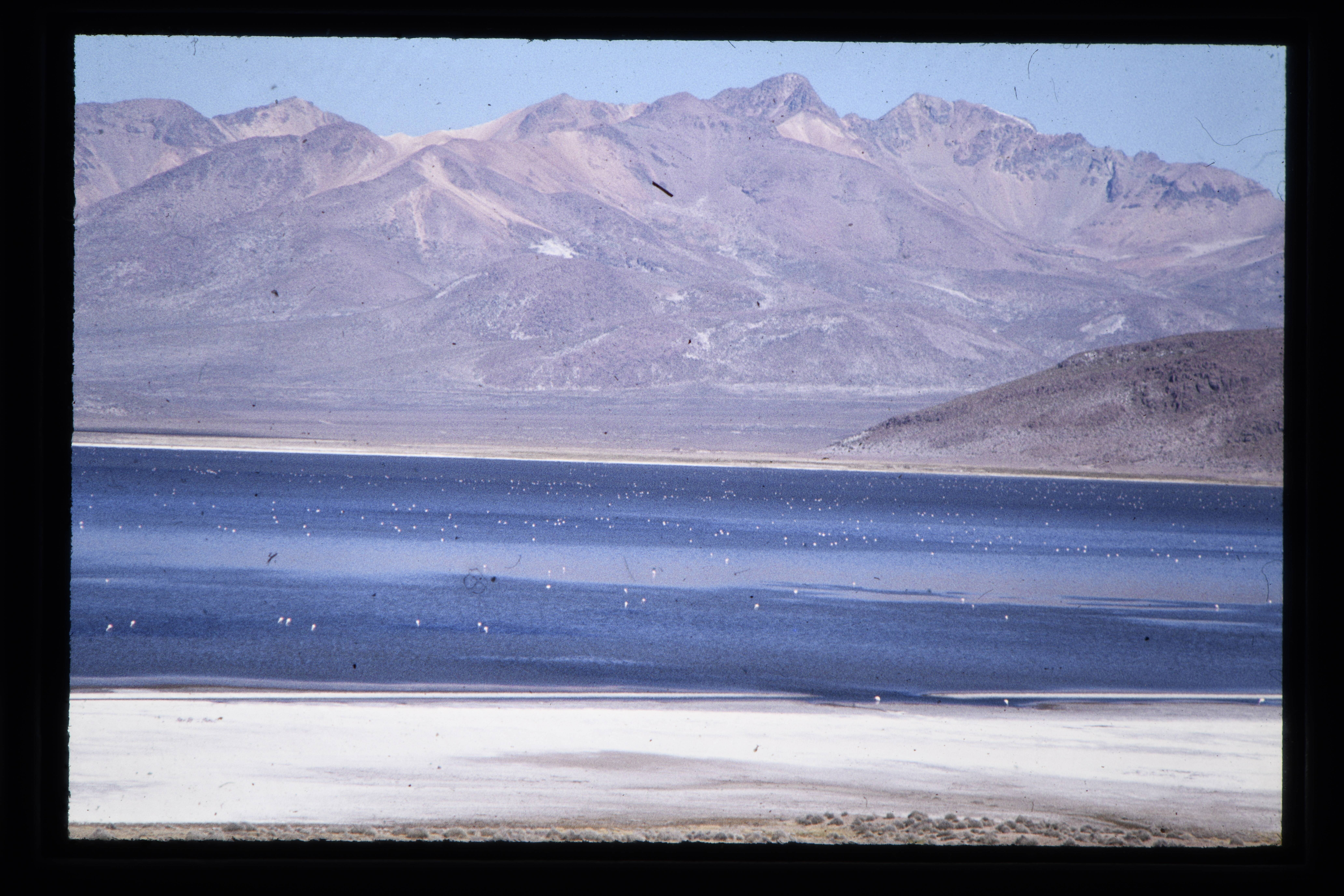'Salinas, het Boraxmeer met flamingo's op 4000 meter hoogte, in het gebergte waarin de vulkaan El Misti te vinden is.'