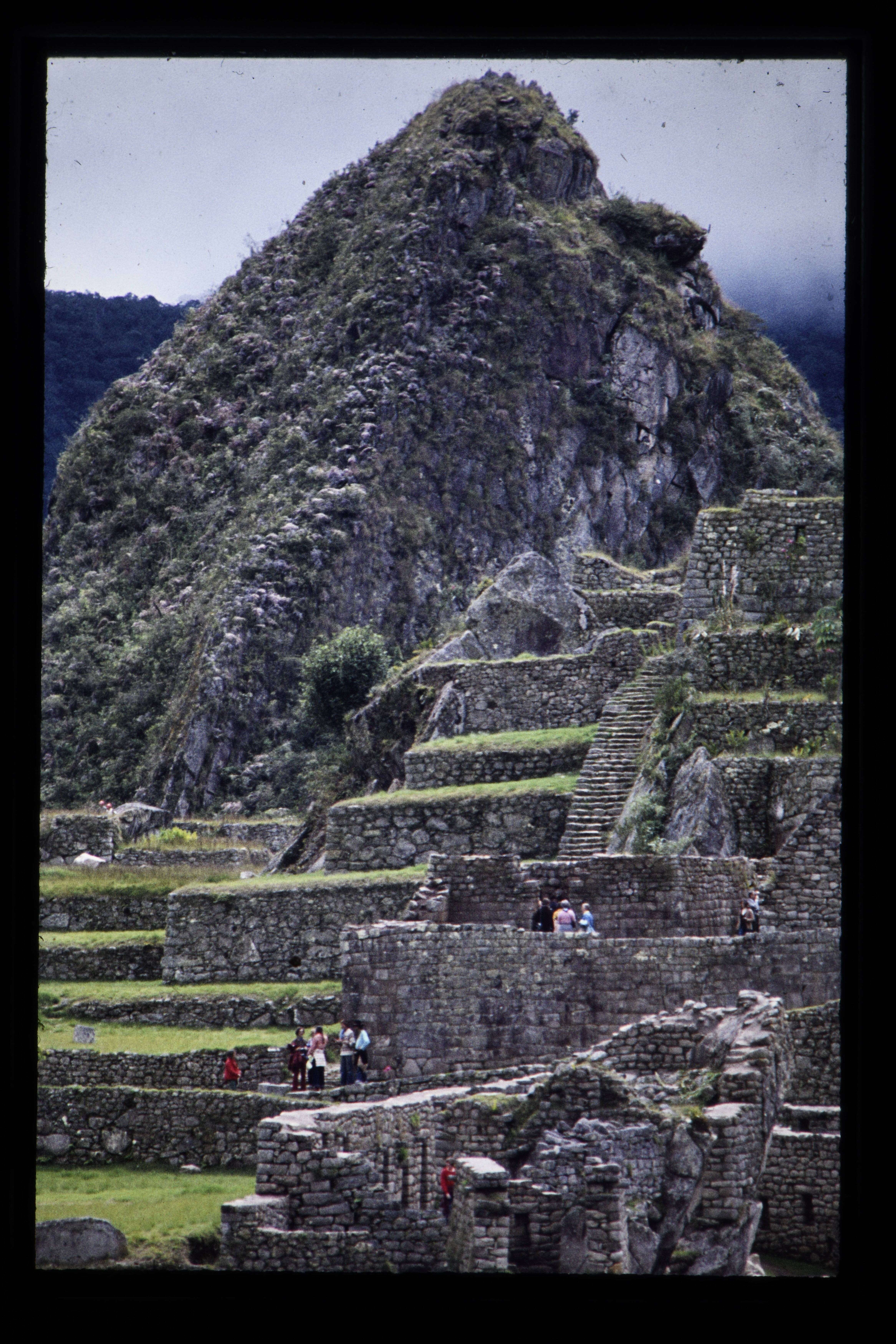 'Machu-Picchu oude ruïne, vestingstad van de Inca's (op 2500 meter hoogte in de zadel van de bergen Machu-Picchu en Huayna-picchu, ontdekt door Bingham in 1911)'