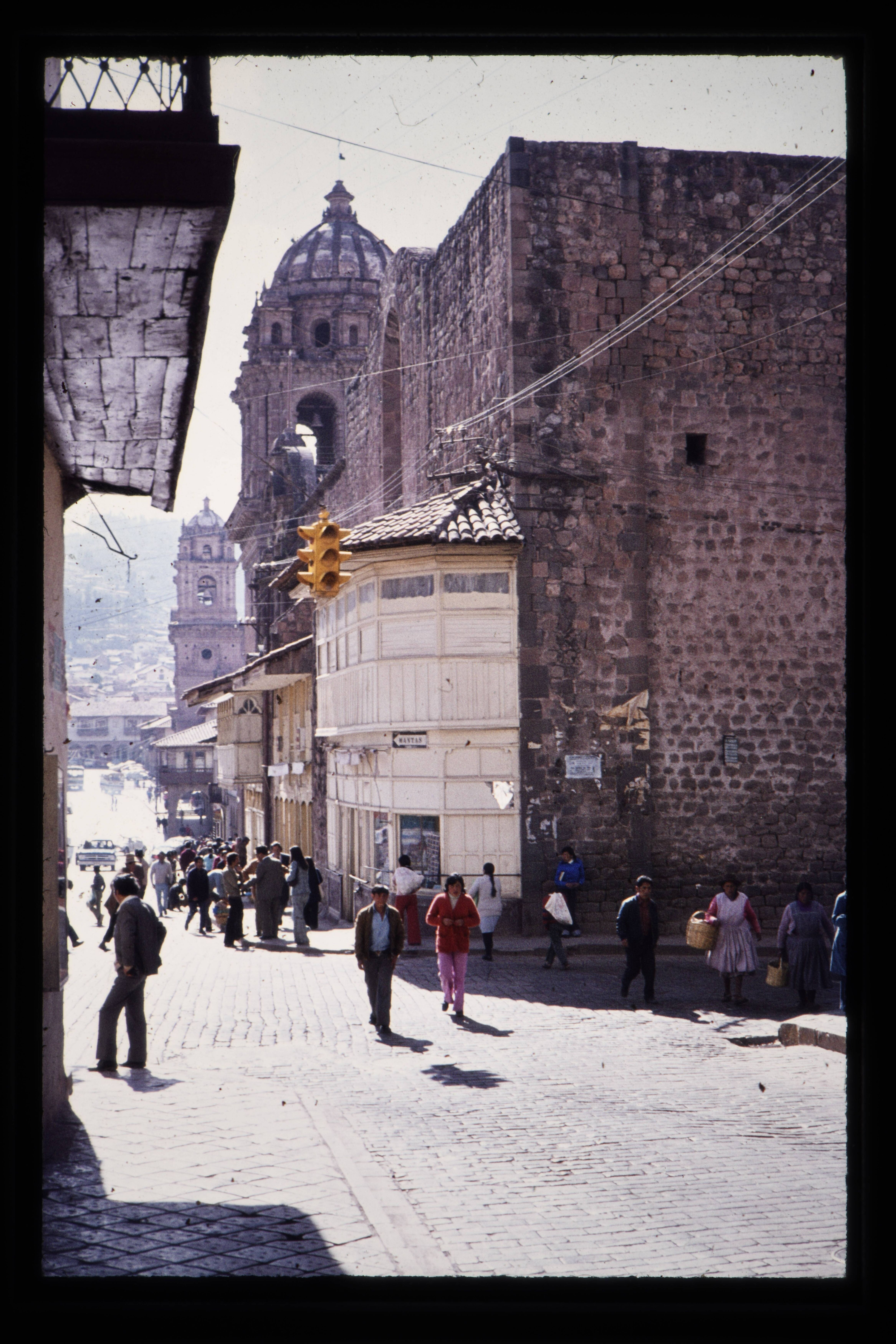 'Straatbeeld Cusco, de oude koloniale gebouwen hebben vaak in de fundering oude Incastenen.'