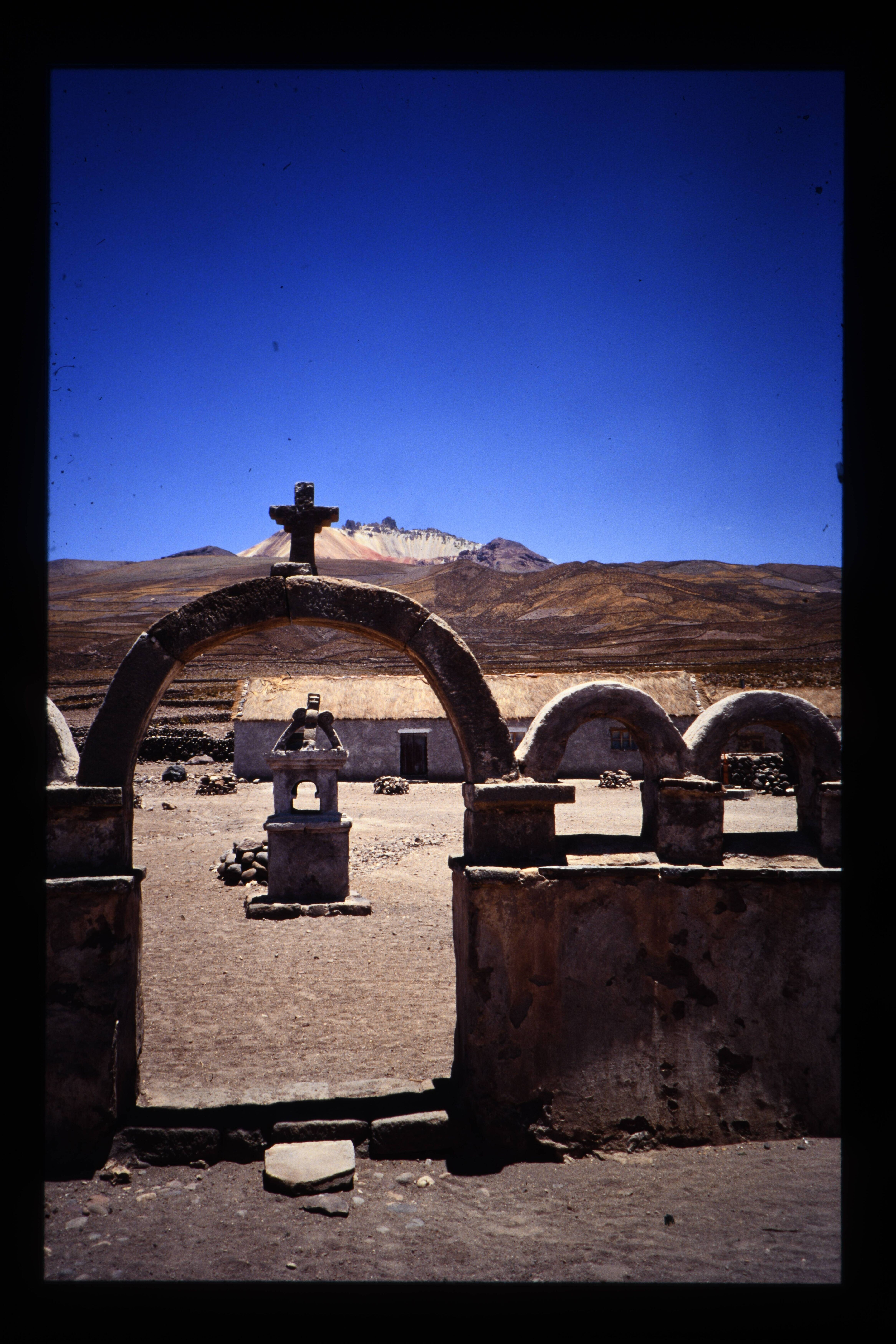 'Schiereiland van de vulkaan Tunupa in het zoutmeer van Uyuni: rond de vulkaan is een serie kerkjes en kapelletjes gebouwd volgens een vast patroon t.o.v. van de vulkaan die een belangrijke rol speelt in de inheemse religie en mythologie. Zie ook de serie '