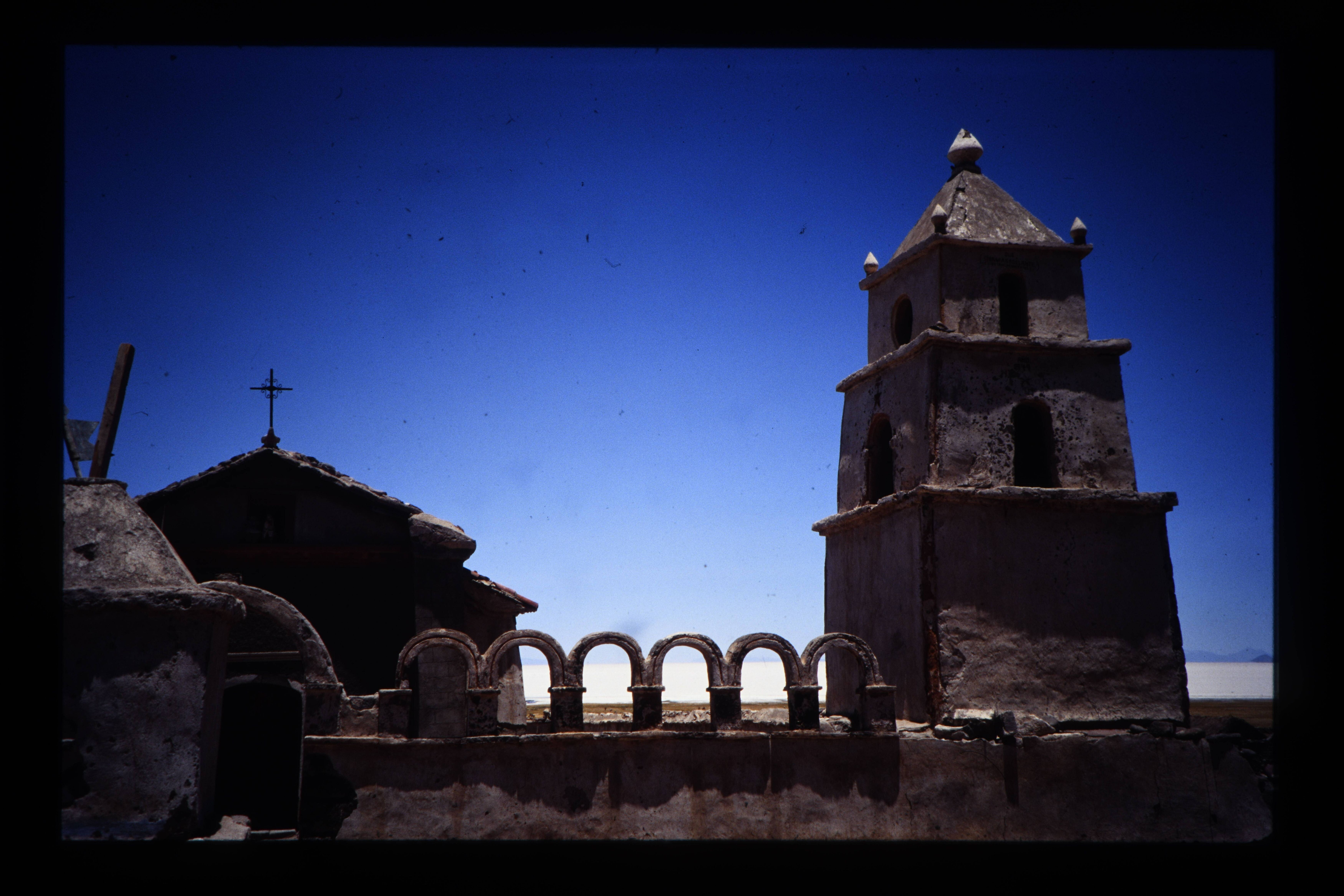'Schiereiland van de vulkaan Tunupa in het zoutmeer van Uyuni: rond de vulkaan is een serie kerkjes en kapelletjes gebouwd volgens een vast patroon t.o.v. van de vulkaan die een belangrijke rol speelt in de inheemse religie en mythologie. Zie ook de serie '