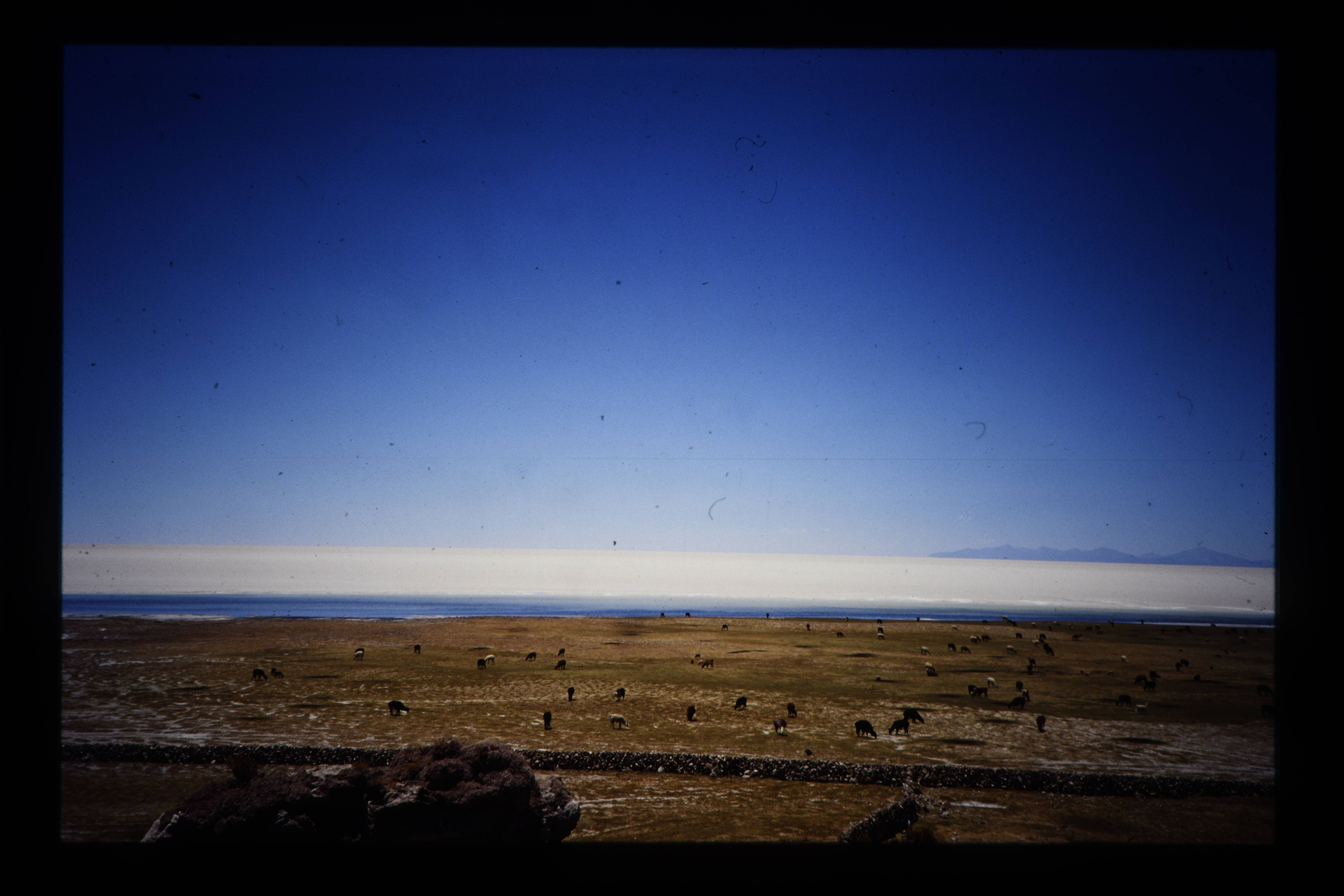 'Het Zoutmeer van Uyuni vanaf het schiereiland bij Tunupa met grazen­ de lama-kudde.'