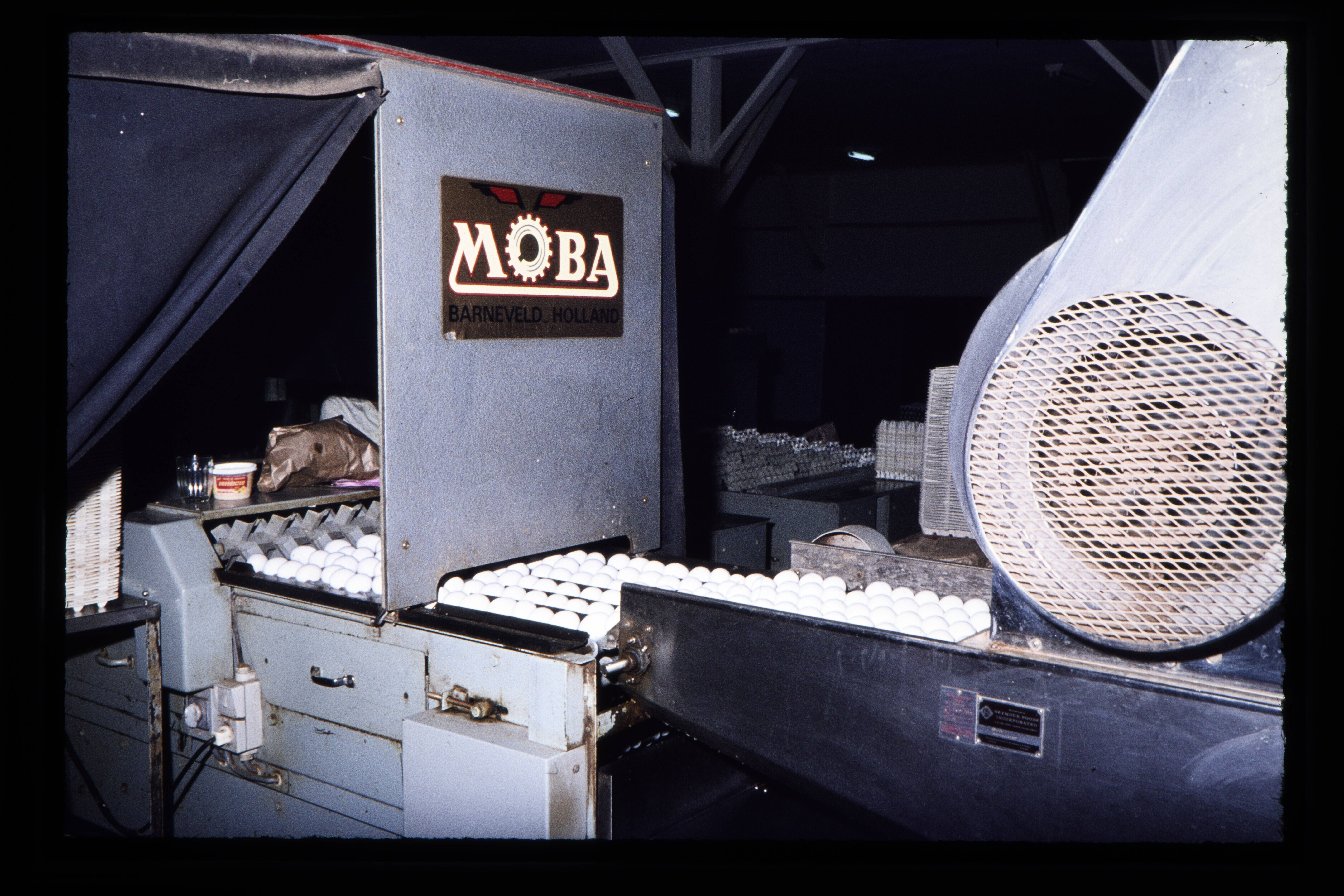 'Eiersorteermachine (uit Barneveld) van Kippeboer. Het werk wordt gedaan door Braziliaanse meisjes. Holambra 2.'