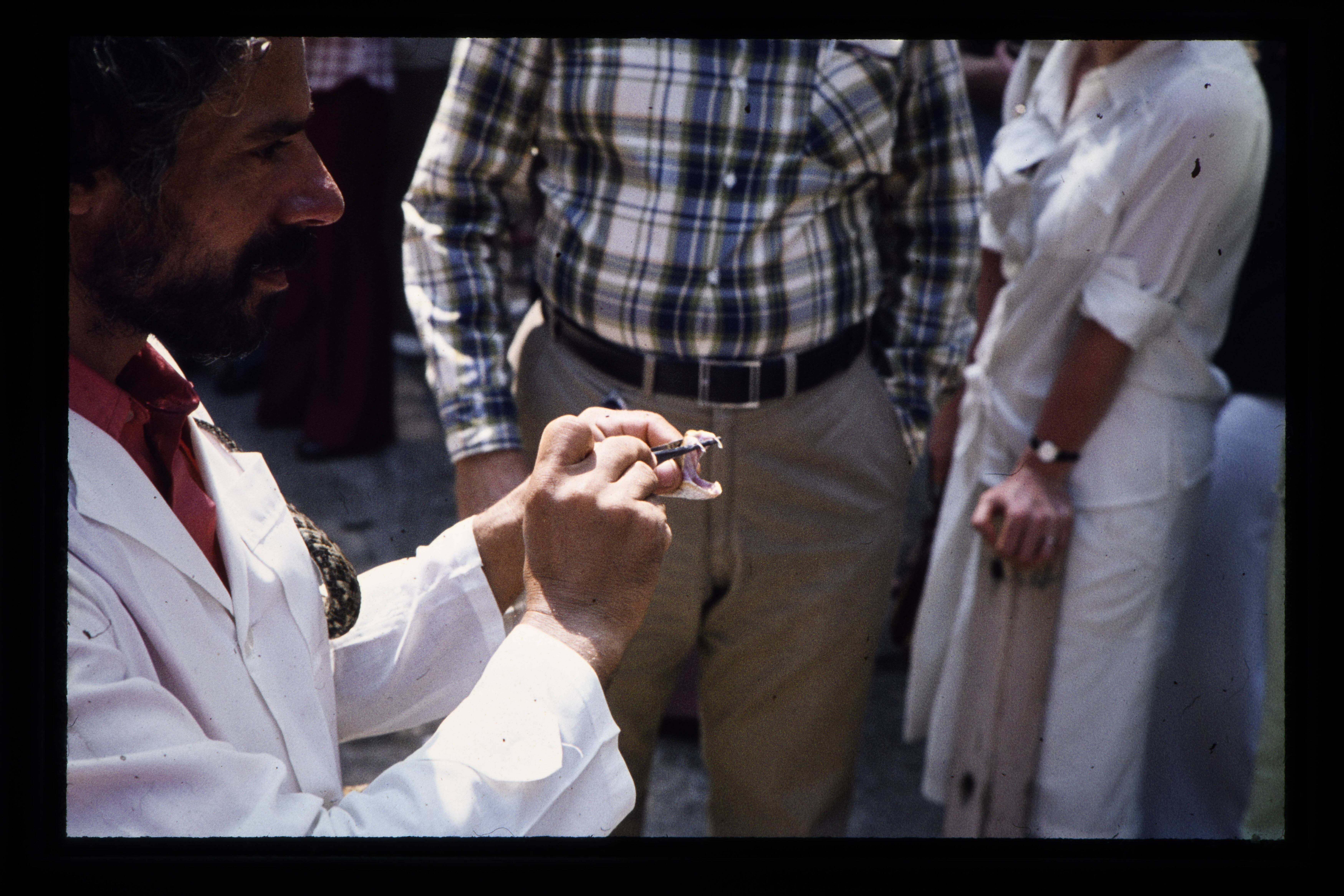 'Slangentuin, demonstratie voor toeristen te Butantã.'