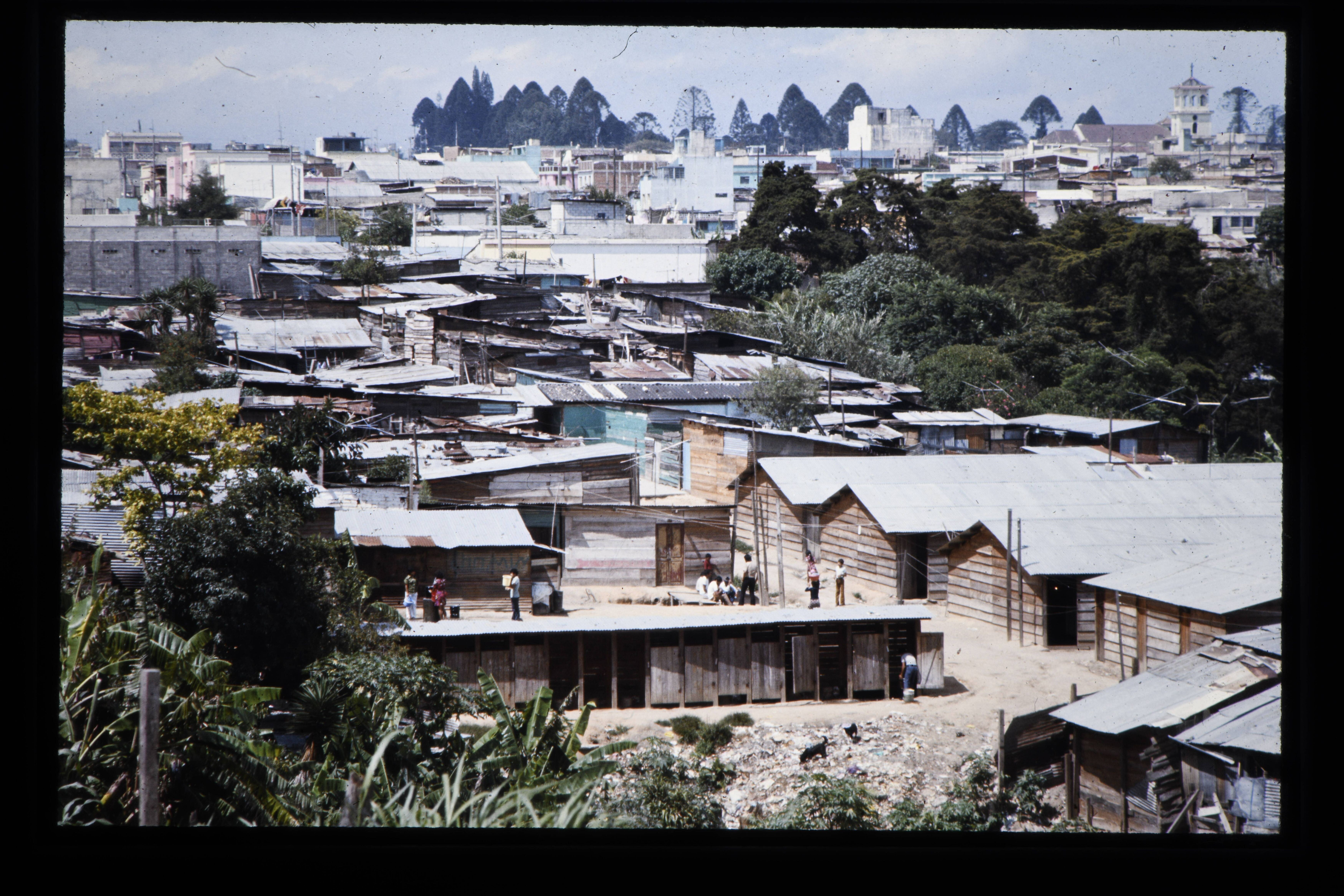 'Sloppenwijk even buiten Guatemala-City. De huizen zijn gebouwd in een aardscheur, veroorzaakt door een aardbeving.'