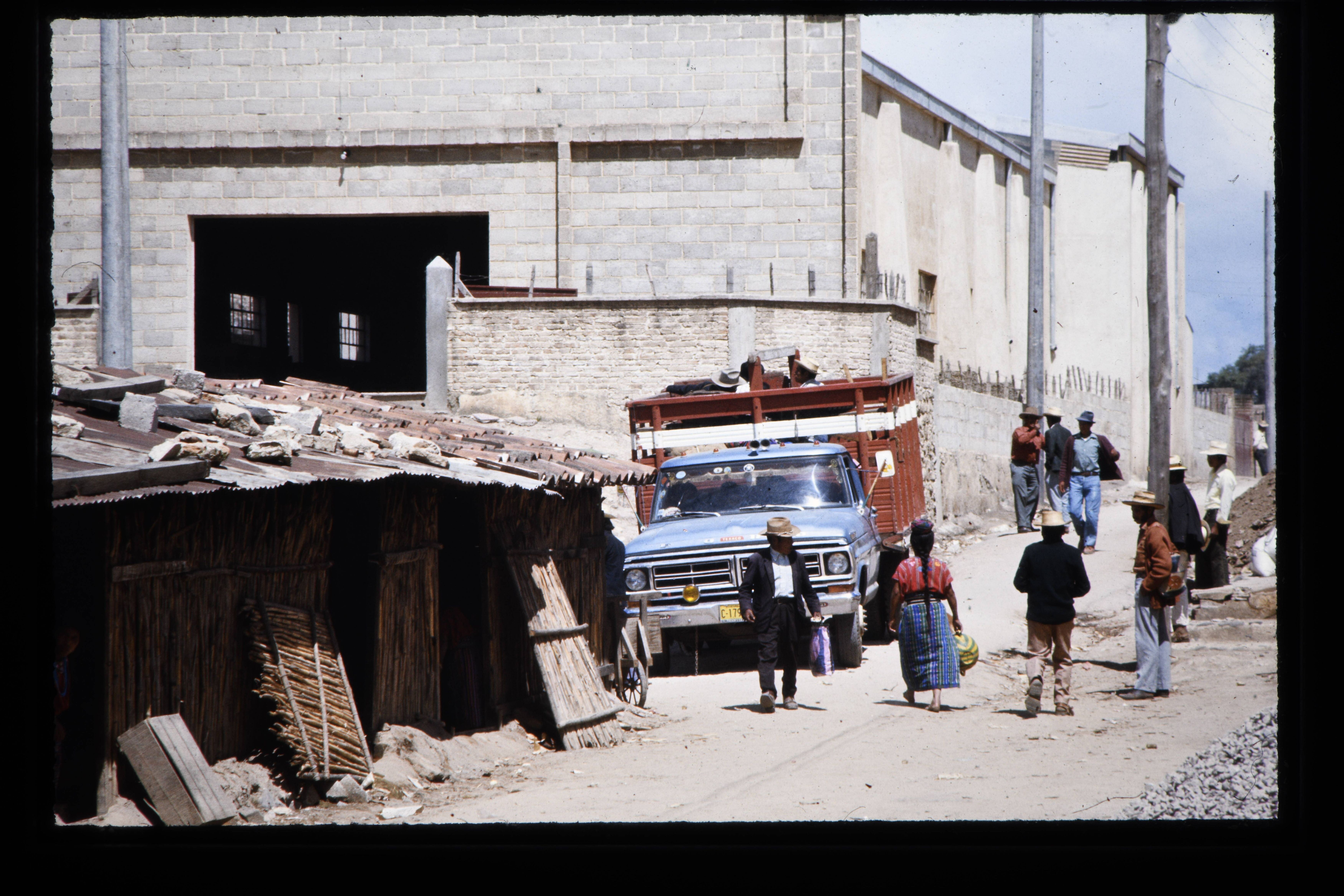 'Straatbeeld Patzún op de achtergrond de nieuwe kerk, de oude kerk was verwoest door de aardbeving van 1976 en op de voorgrond een woning gemaakt van sloophout.'