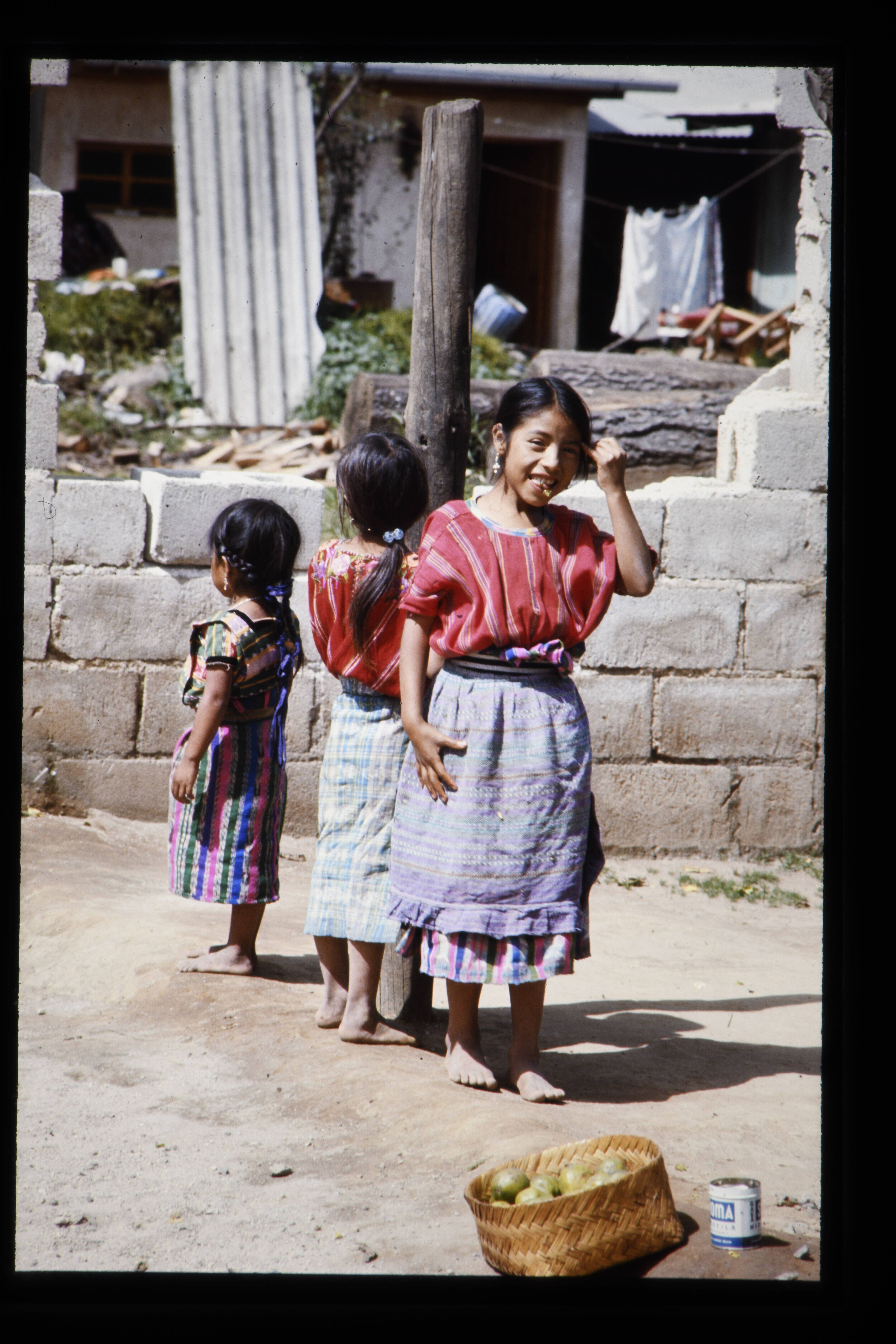 'Kindertjes in kleurrijke kleding, op de achtergrond een gedeelte van een muur van een woning. Tussen de voegen zit nu al geen cement meer en men heeft het bouwen ook dan maar gestaakt.'