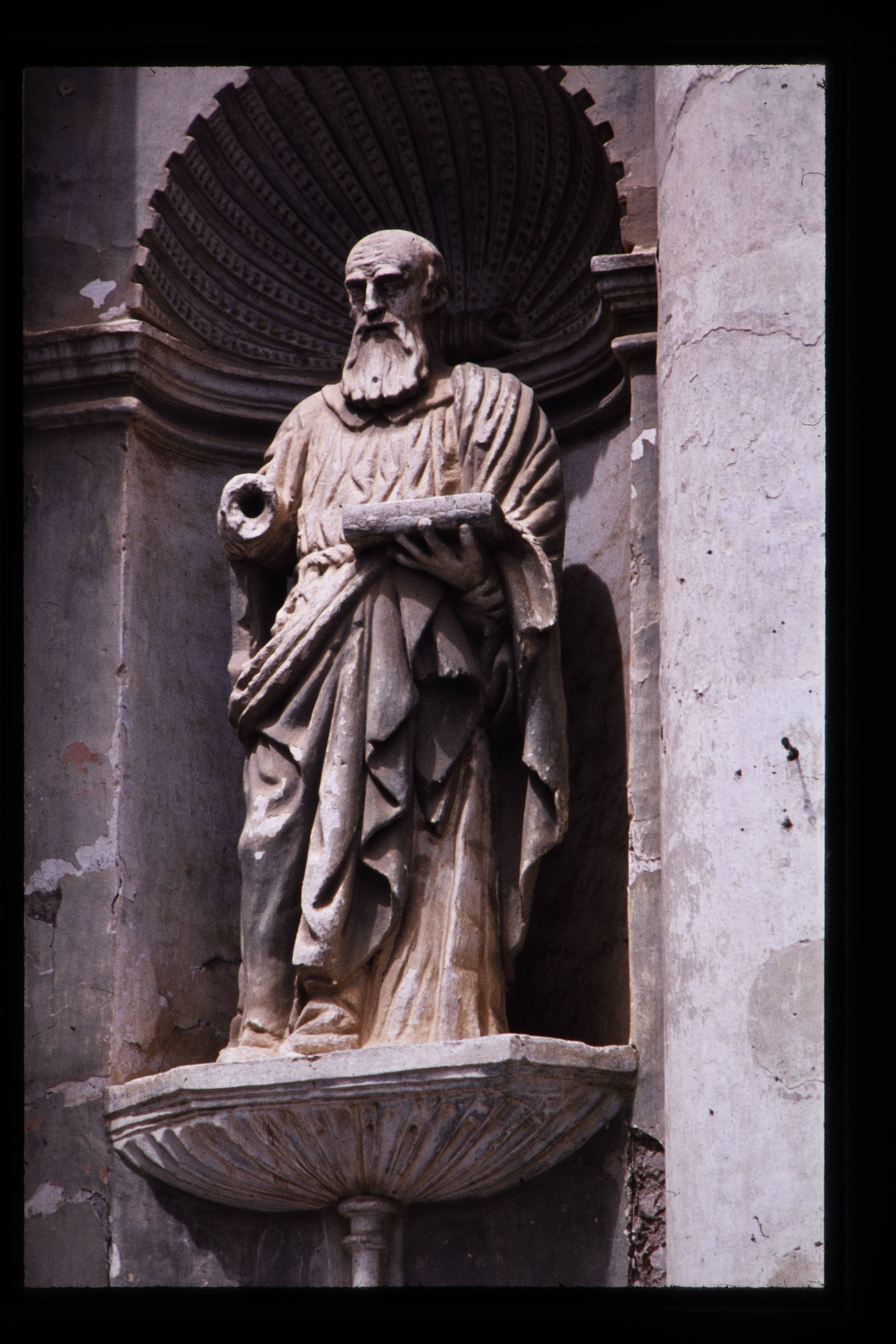 'Close-up beeld van de kathedraal te Antigua, daterend uit 1669. 0ok hier heeft de aardbeving van februari 1976 zijn sporen achtergelaten.'