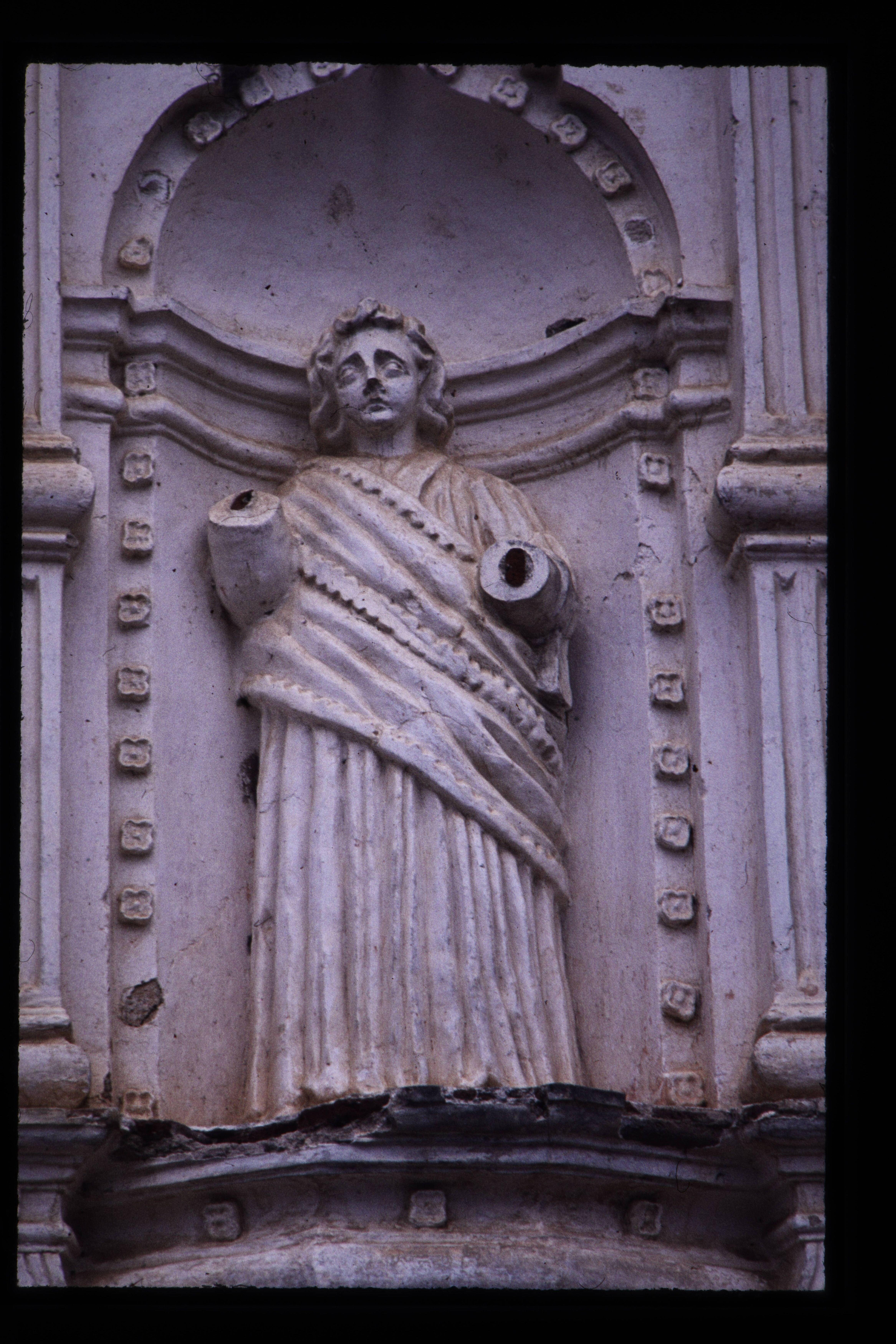 'Close-up van een heiligen beeld in een nis, die de muur van de Santa Ana kerk siert.'