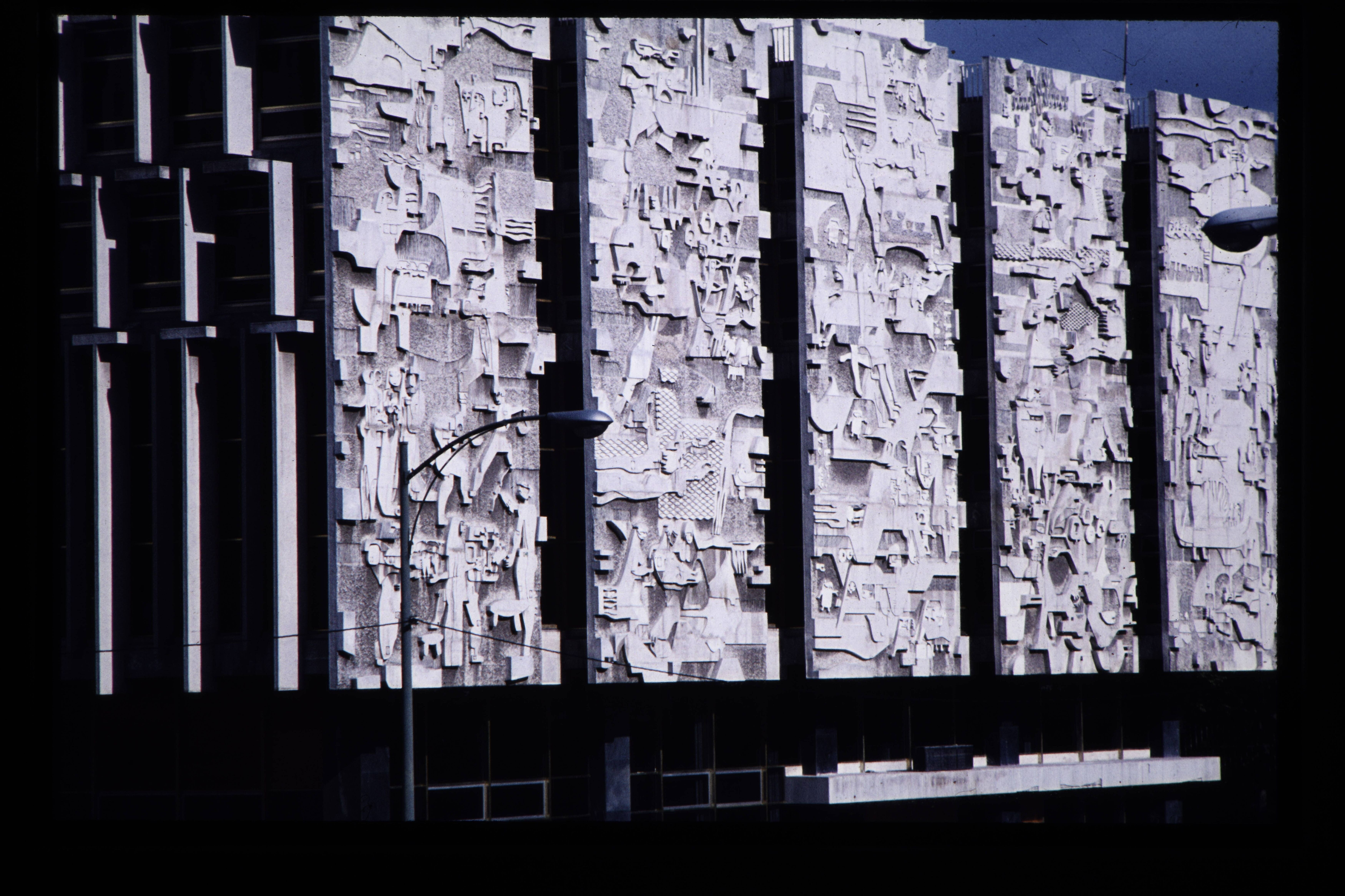 'De gebeeldhouwde buitenmuur van de Centrale Bank te Guatemala-city.'