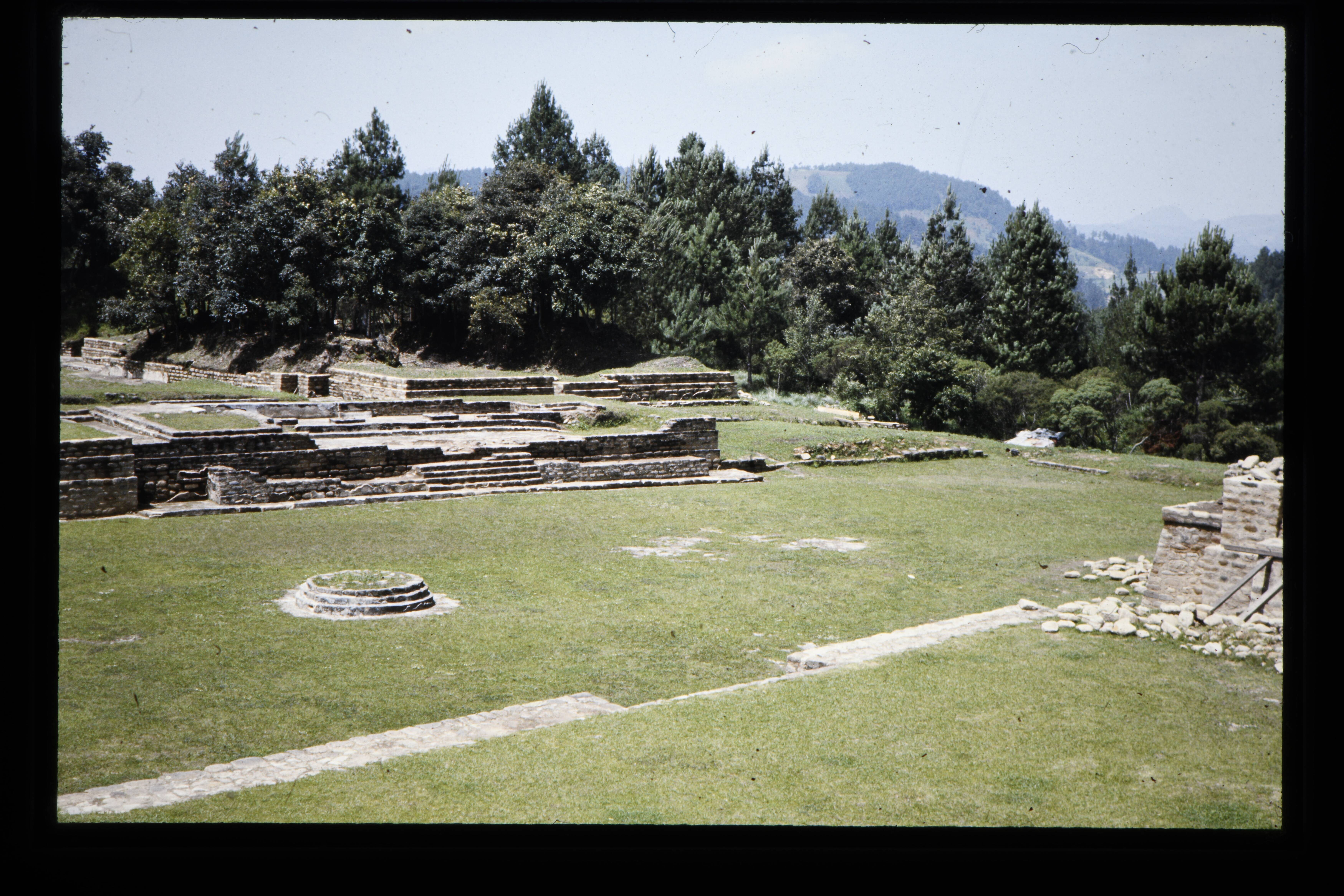 'Lximche, ruïnes van het oude "Indiaanse" Cakchiquel koninkrijk, gebouwd in 1470 en in 1525 door Pedro de Alvarado verwoest.'